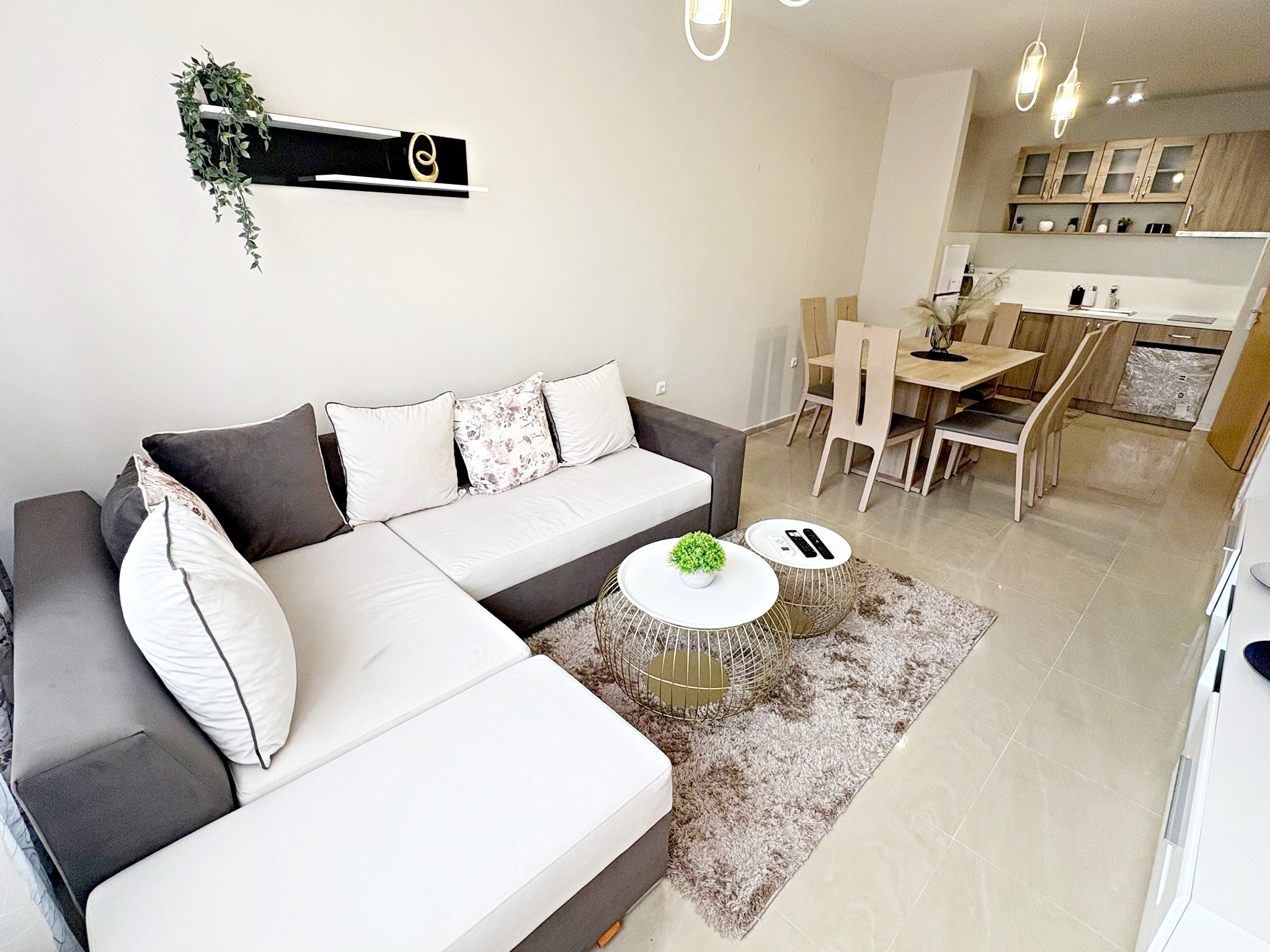 Апартамент общей площадью 62 кв.м. расположен на первом этаже и состоит из прихожей, гостиной с зоной для кухни, спальни, ванной комнаты с туалетом и террасы с видом на территорию комплекса. Апартамент после ремонта, полностью меблированный и готов к заселению.