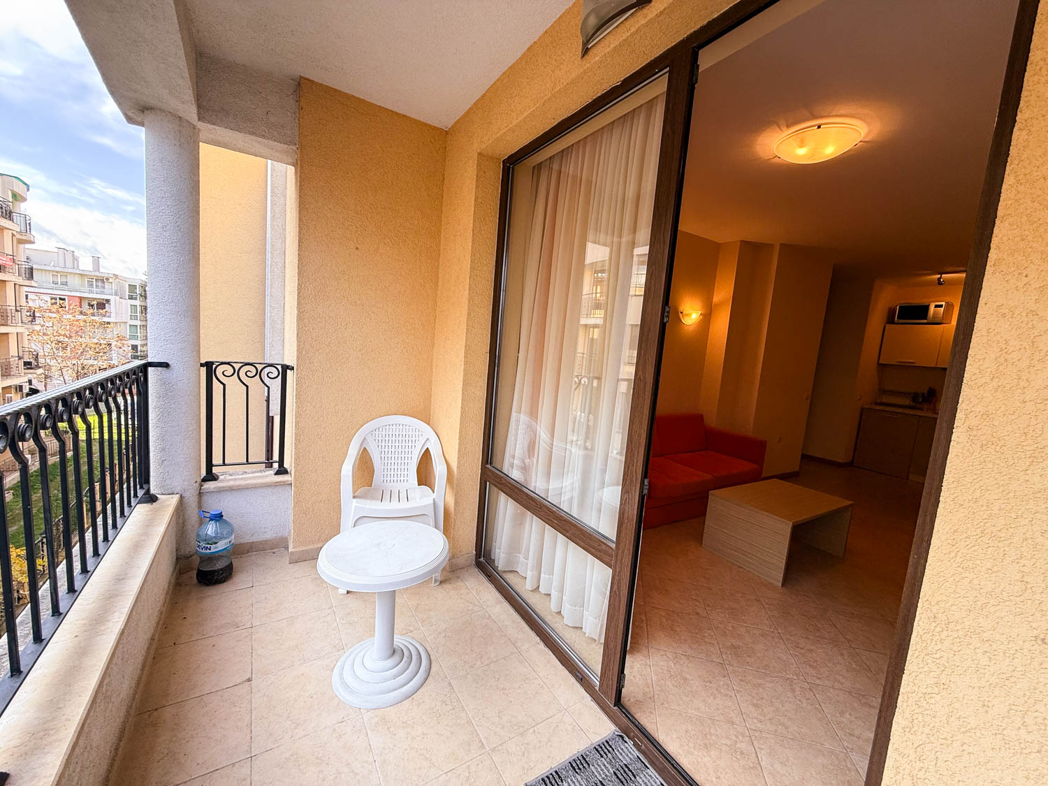Квартира общей площадью 60 кв.м. находится на 4 этаже и состоит из гостиной с кухонным уголком, спальни, ванной комнаты с туалетом и террасы с видом на территорию комплекса. Продается с мебелью и техникой.