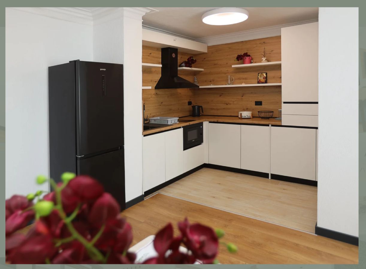 Апартамент площадью 66,67 кв. м. расположен на третьем этаже здания с лифтом. Состоит из прихожей, гостиной с зоной для кухни, спальни, ванной комнаты с туалетом и террасы с видом на город. Предлагается с новой мебелью и техникой.