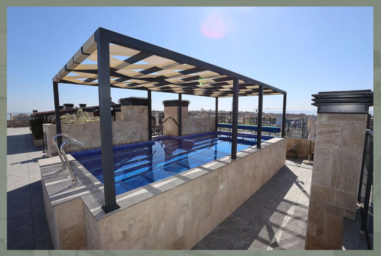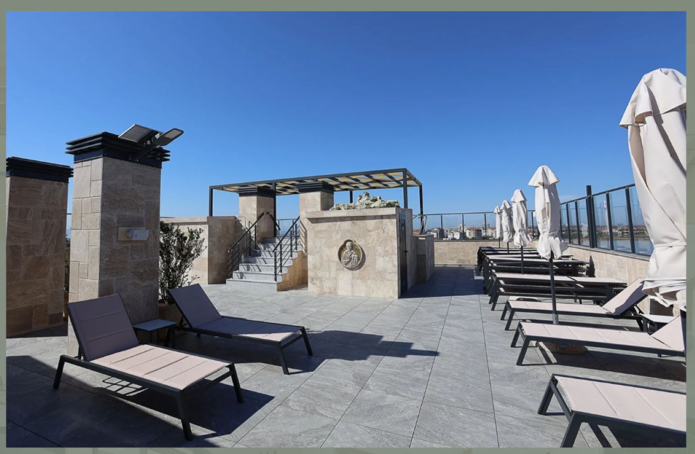 Архитектура здания выполнена в классическом стиле, с характерными фризами и орнаментами. На верхнем этаже расположена эксклюзивная солнечная терраса с джакузи и зоной отдыха.