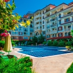 а территории комплекса есть открытый бассейн с баром, из которого открывается потрясающий вид на море и пляж. Для детей есть детский бассейн и детская площадка. Среди особенностей комплекса – СПА центр с сауной, массажем и солярием, фитнес-зал, ресторан с болгарской и международной кухней, где подают завтраки, обеды и ужины.
