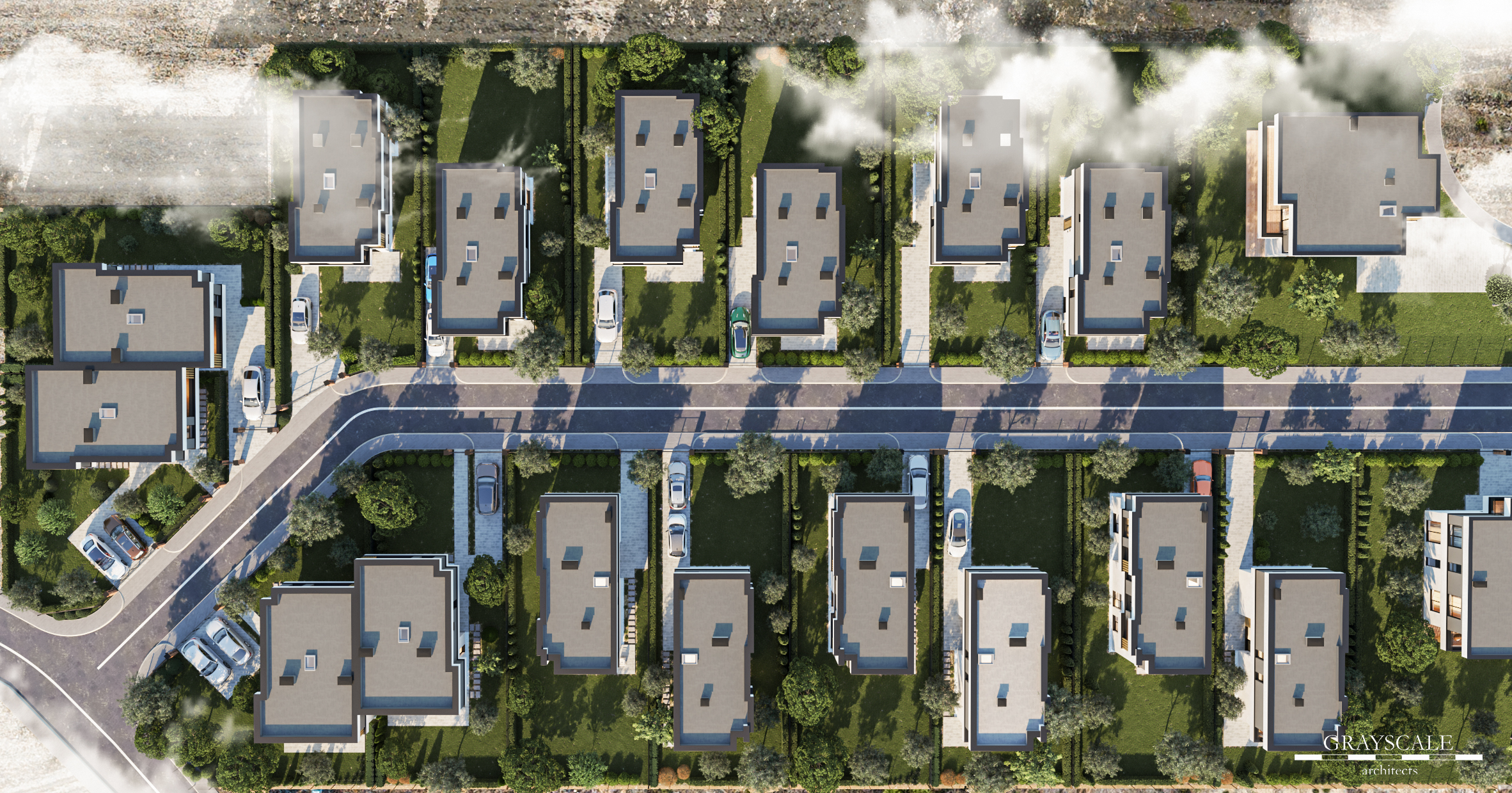 Комплекс состоит из 18 домов, 2 из них площадью 350 квадратных метров каждый с двором 800 квадратных метров, остальные 16 домов площадью около 180 квадратных метров с двором 400 квадратных метров.