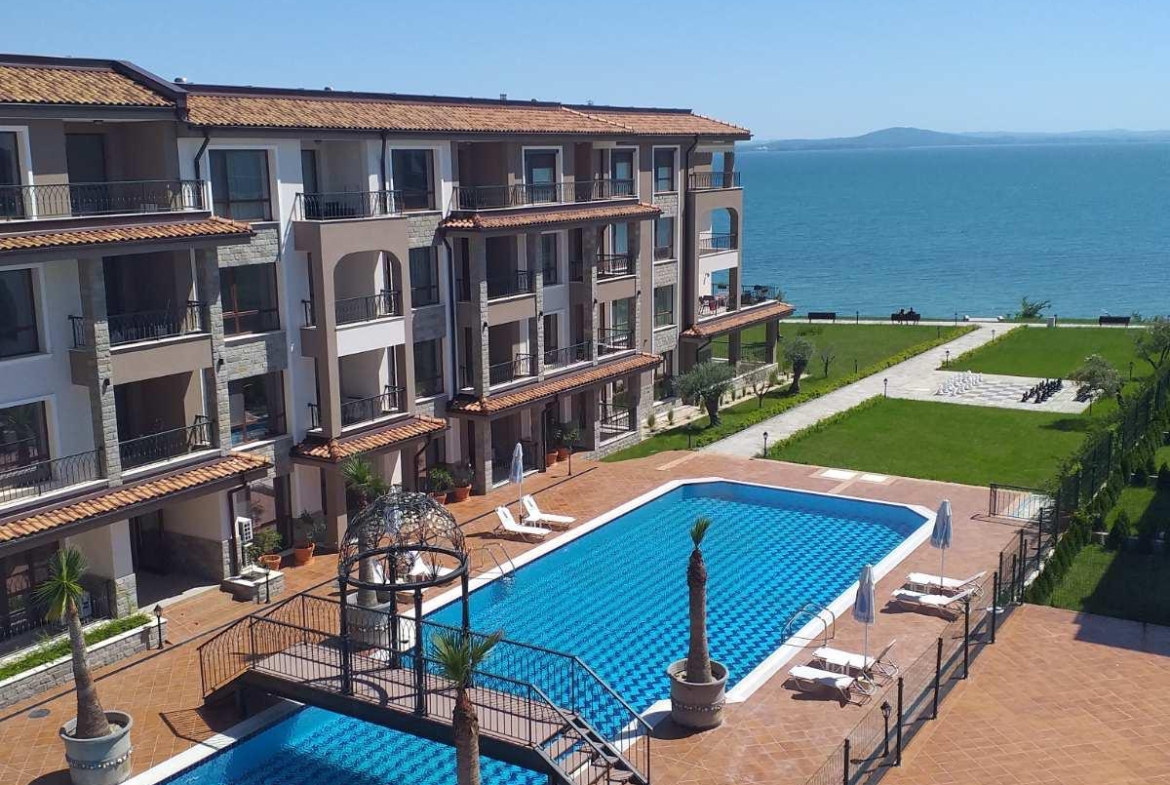Предлагаем на продажу двухкомнатную квартиру с боковым видом на море в закрытом комплексе на первой линии в районе Сарафово, Бургас.