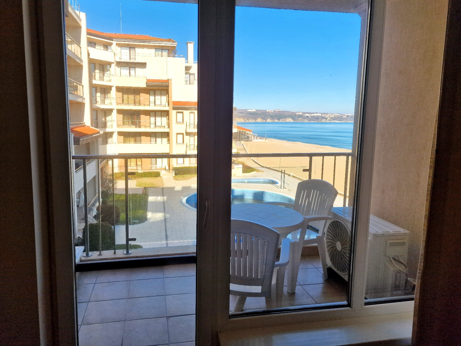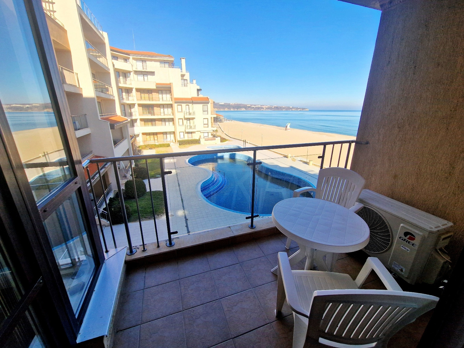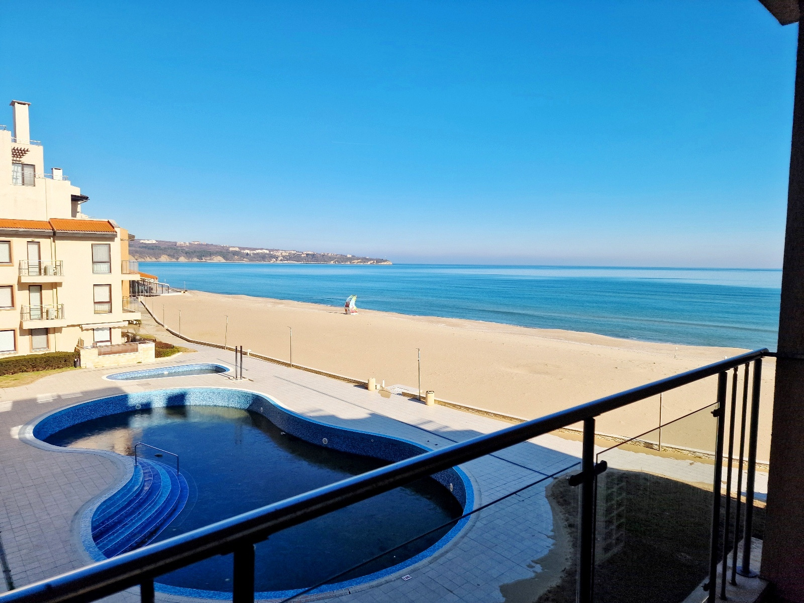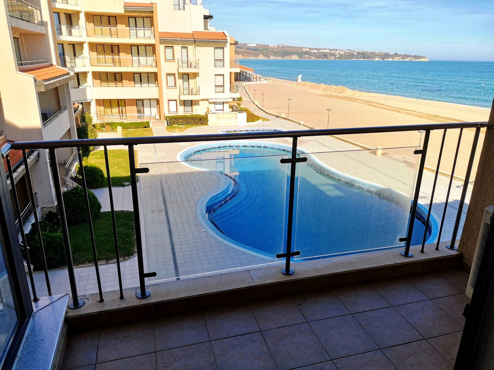 Предлагаем вам уникальную возможность приобрести просторную двухкомнатную квартиру в престижном комплексе на первой линии моря в городе Обзор. Квартира площадью 69 кв. м расположена на третьем этаже и предлагает захватывающий вид на море, пляж и ухоженную внутреннюю территорию комплекса с бассейном.