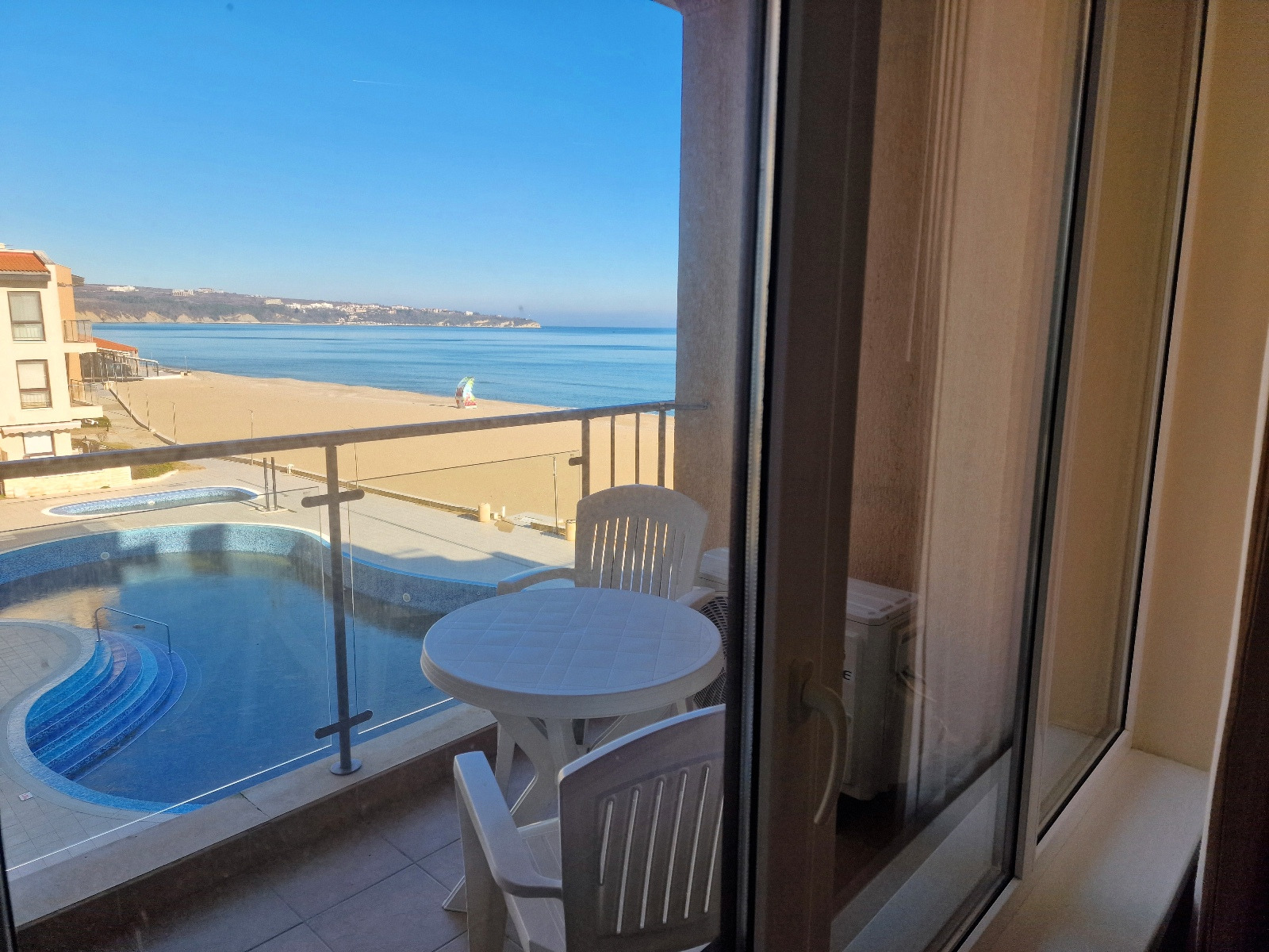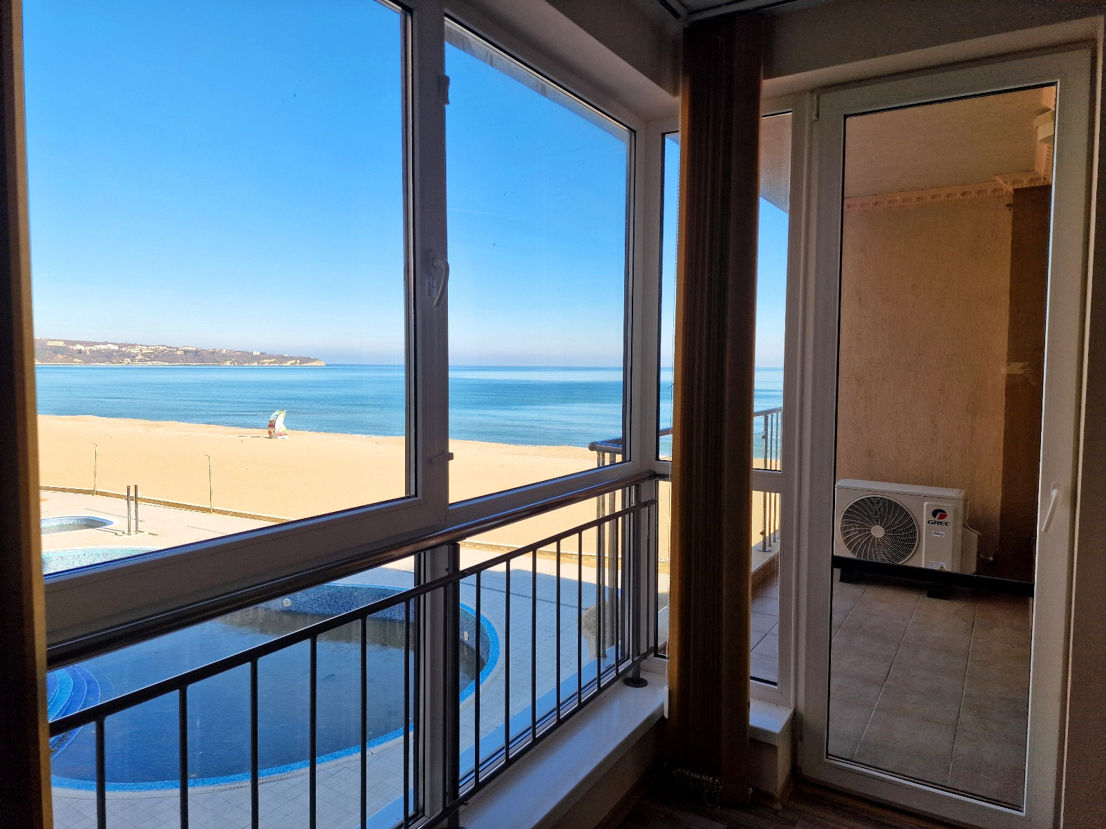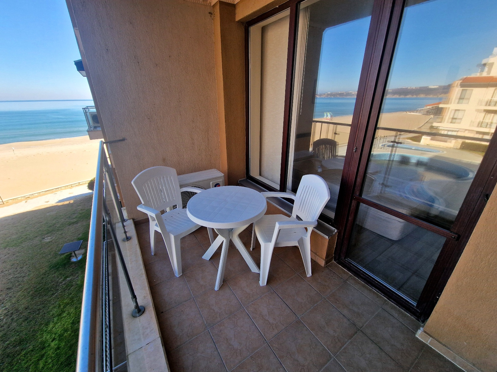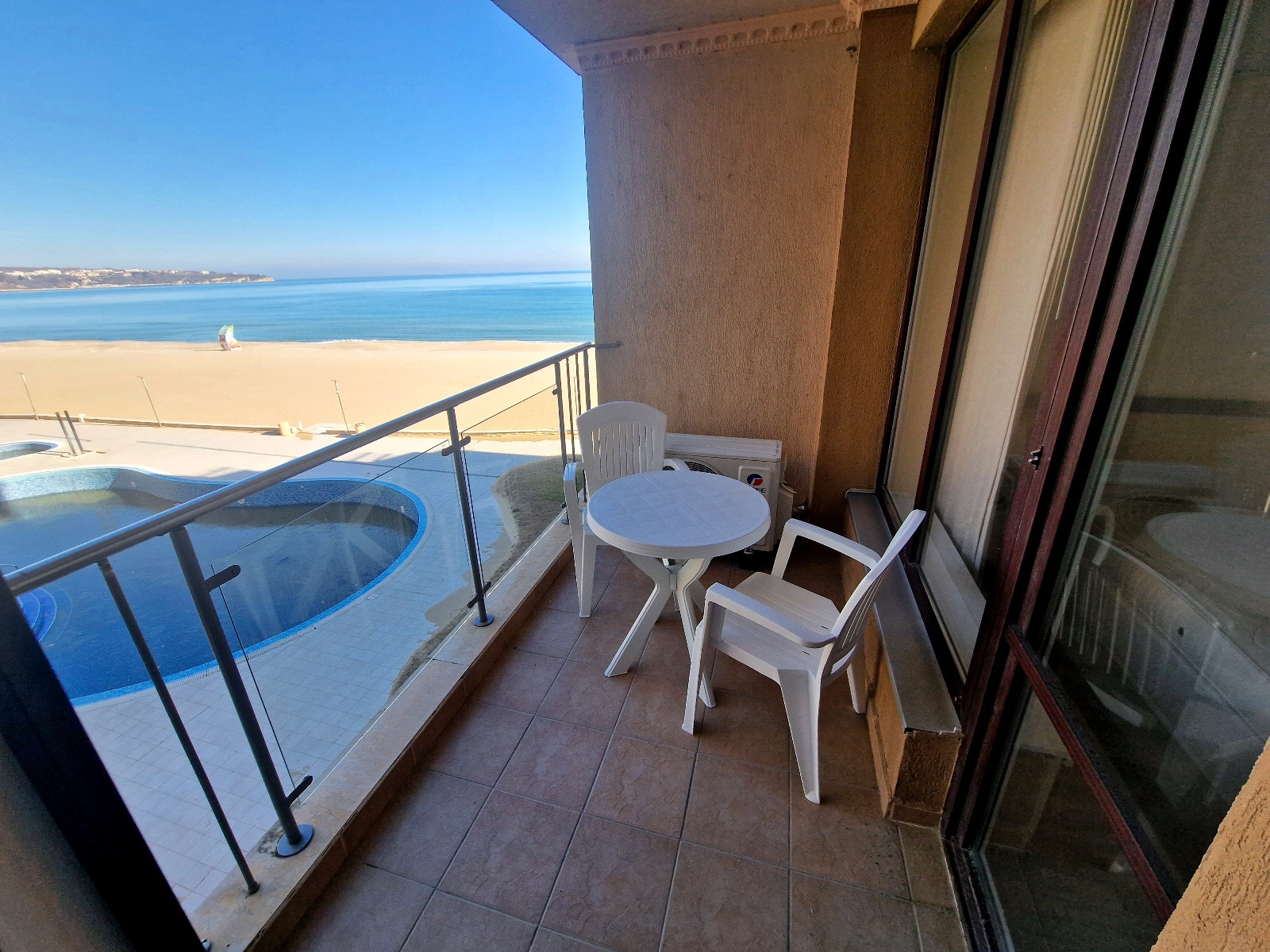 Предлагаем вам уникальную возможность приобрести просторную двухкомнатную квартиру в престижном комплексе на первой линии моря в городе Обзор. Квартира площадью 69 кв. м расположена на третьем этаже и предлагает захватывающий вид на море, пляж и ухоженную внутреннюю территорию комплекса с бассейном.