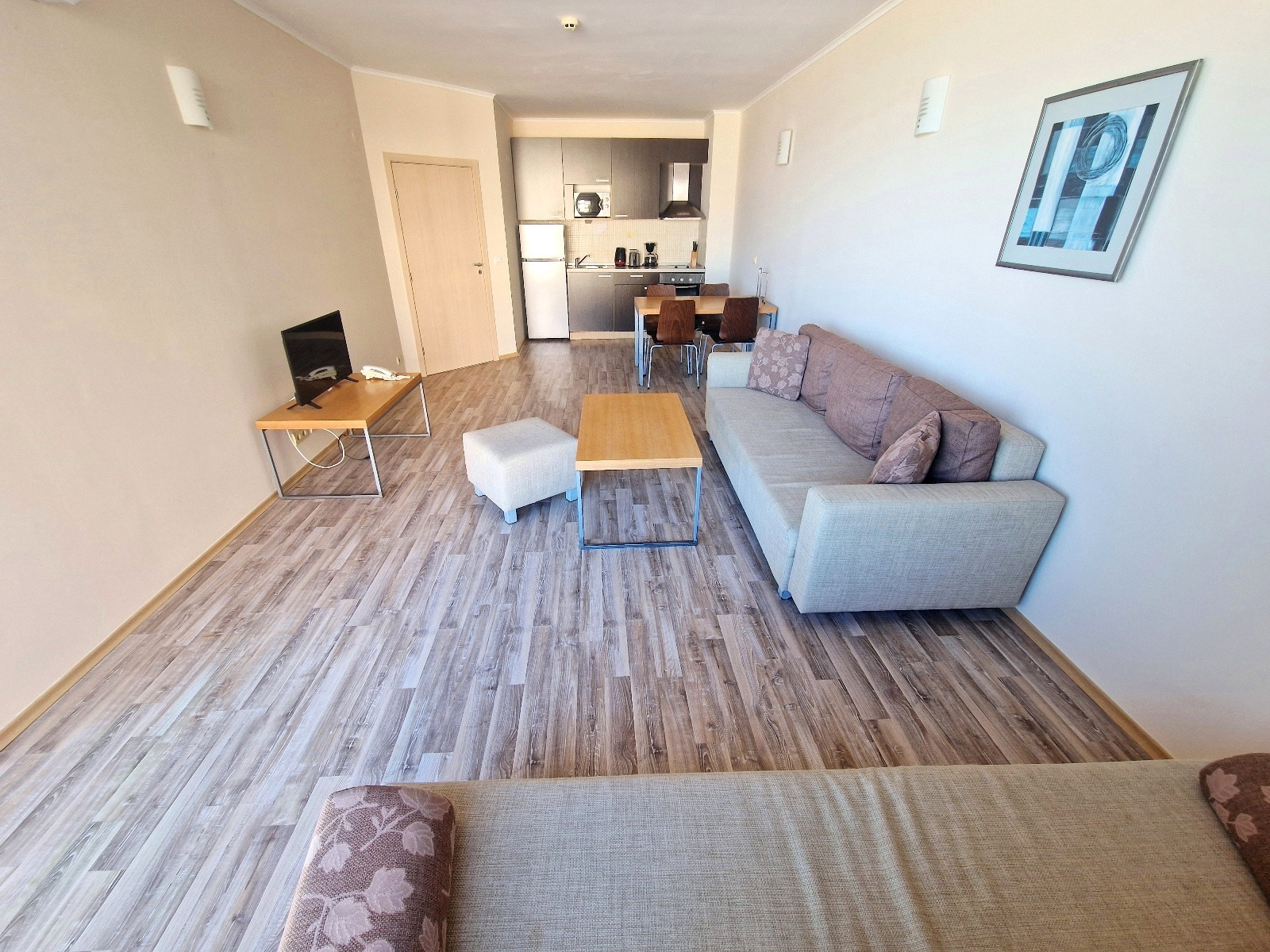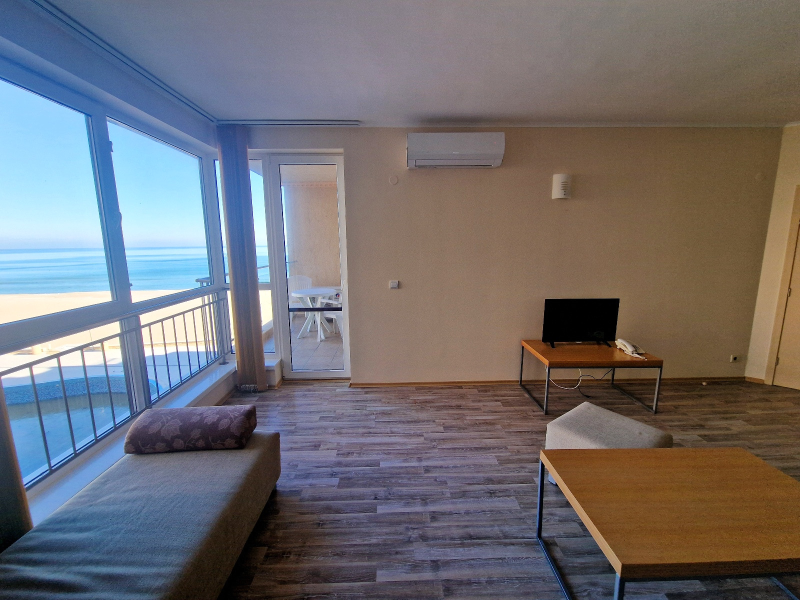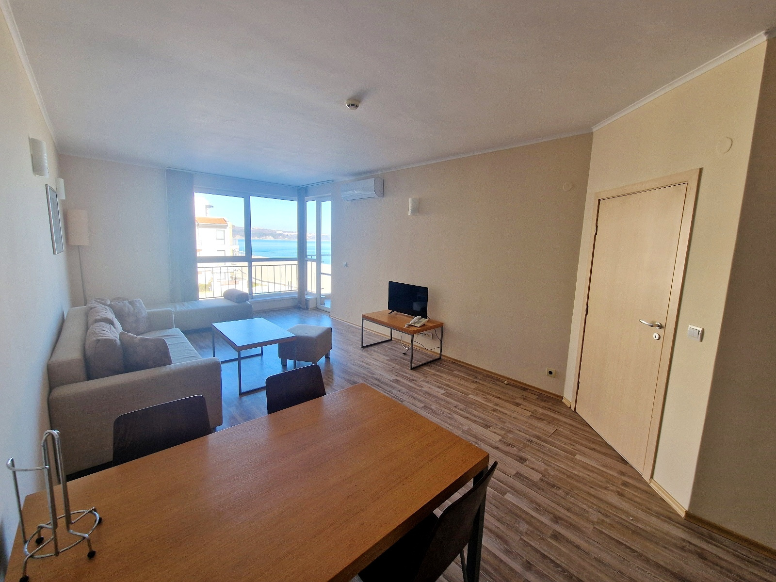 Планировка квартиры включает прихожую, просторную гостиную, совмещенную с мини-кухней и обеденной зоной, отдельную спальню, ванную комнату с туалетом и балкон, на который есть выход из обеих комнат. Большие окна обеспечивают обилие естественного света и открывают беспрепятственный вид на окружающую природу и морское побережье. Квартира полностью оборудована удобной и элегантной мебелью и предлагает все необходимые удобства для комфортного проживания и отдыха.