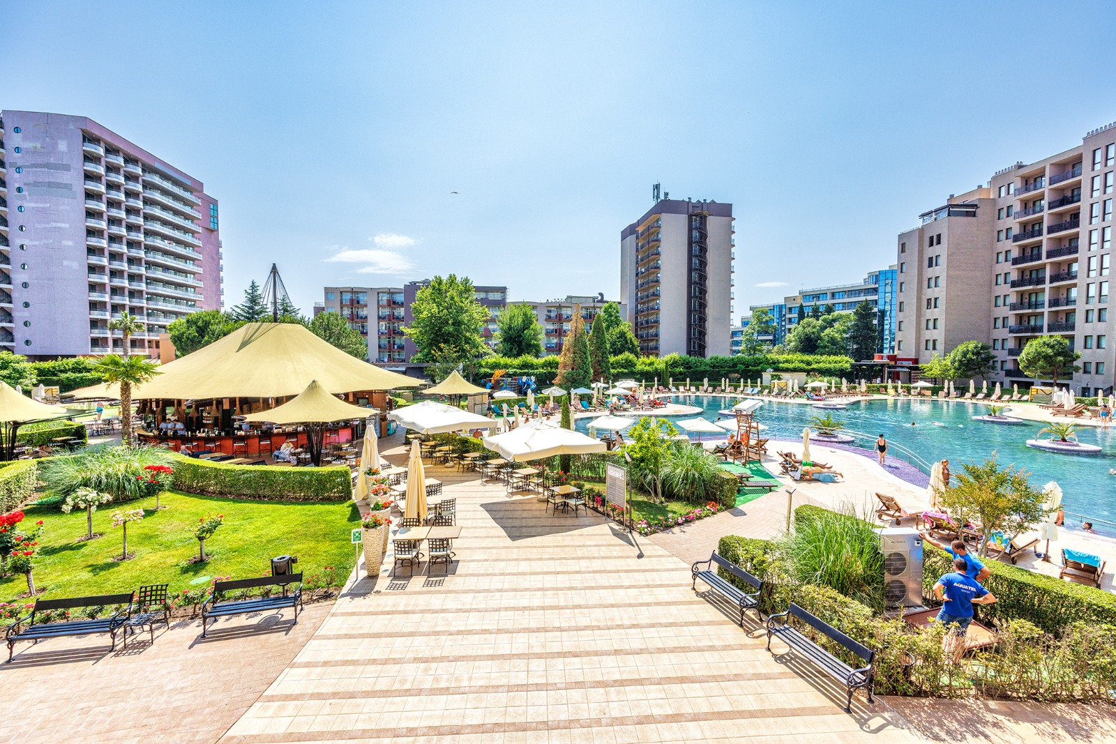 К услугам гостей и владельцев несколько открытых бассейнов для взрослых с детскими секциями, зоны отдыха и загара с шезлонгами, роскошный СПА-центр, фитнес-центр, ресторан, круглосуточный бар, прекрасно озелененные территории, конференц-зал, двухуровневый подземный паркинг, а также открытый торговый центр.
