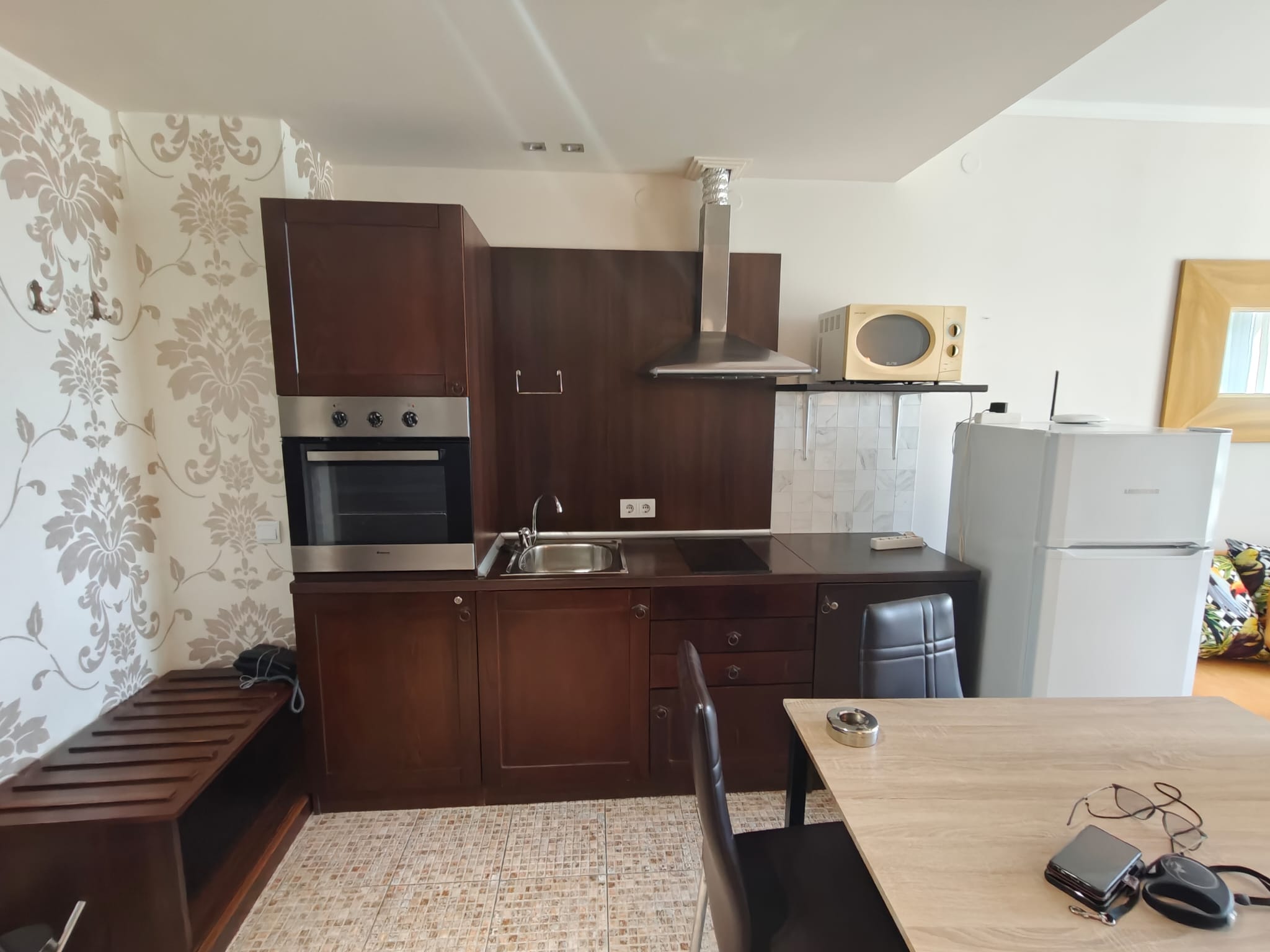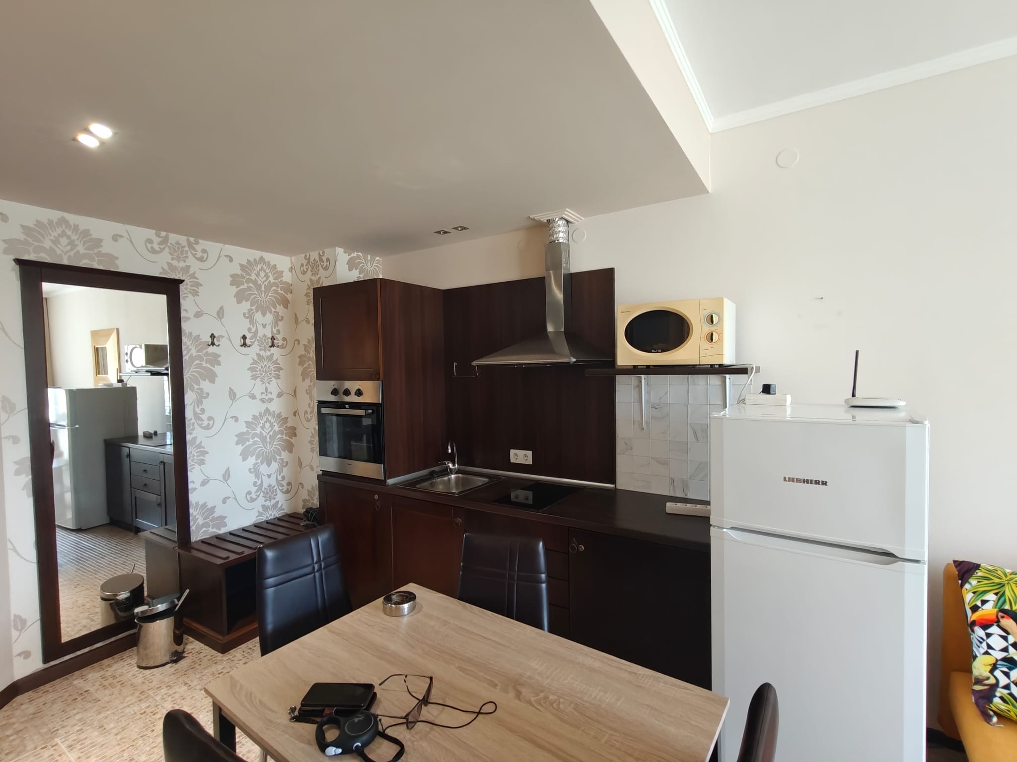 Квартира продается в отличном состоянии, меблирована и оборудована, готова к заселению. Планировка квартиры следующая — гостиная с небольшой кухней и обеденной зоной, светлая спальня, прихожая, ванная комната с туалетом и ванной, балкон с видом на город.