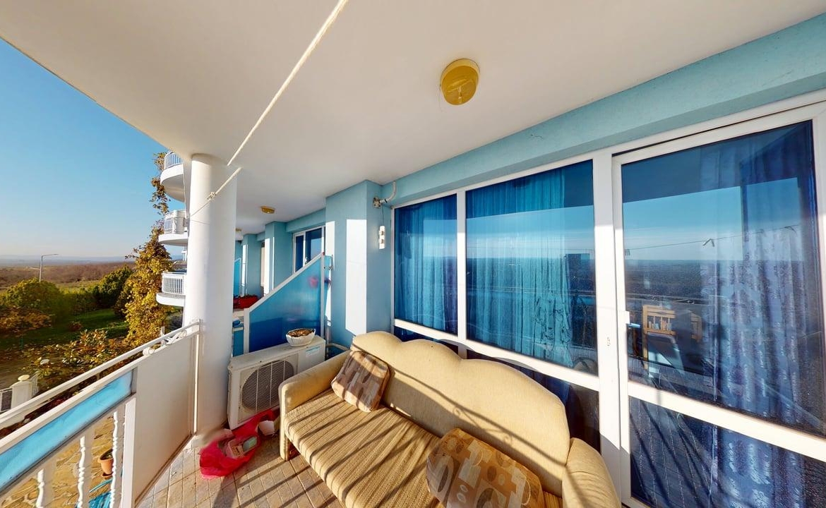 Квартира, площадью 70 кв.м., расположена на 2 этаже и состоит из прихожей, гостиной с зоной для кухни, спальни, ванной комнаты с туалетом и террасы с видом на Солнечный берег. Квартира предлагается с мебелью и техникой.