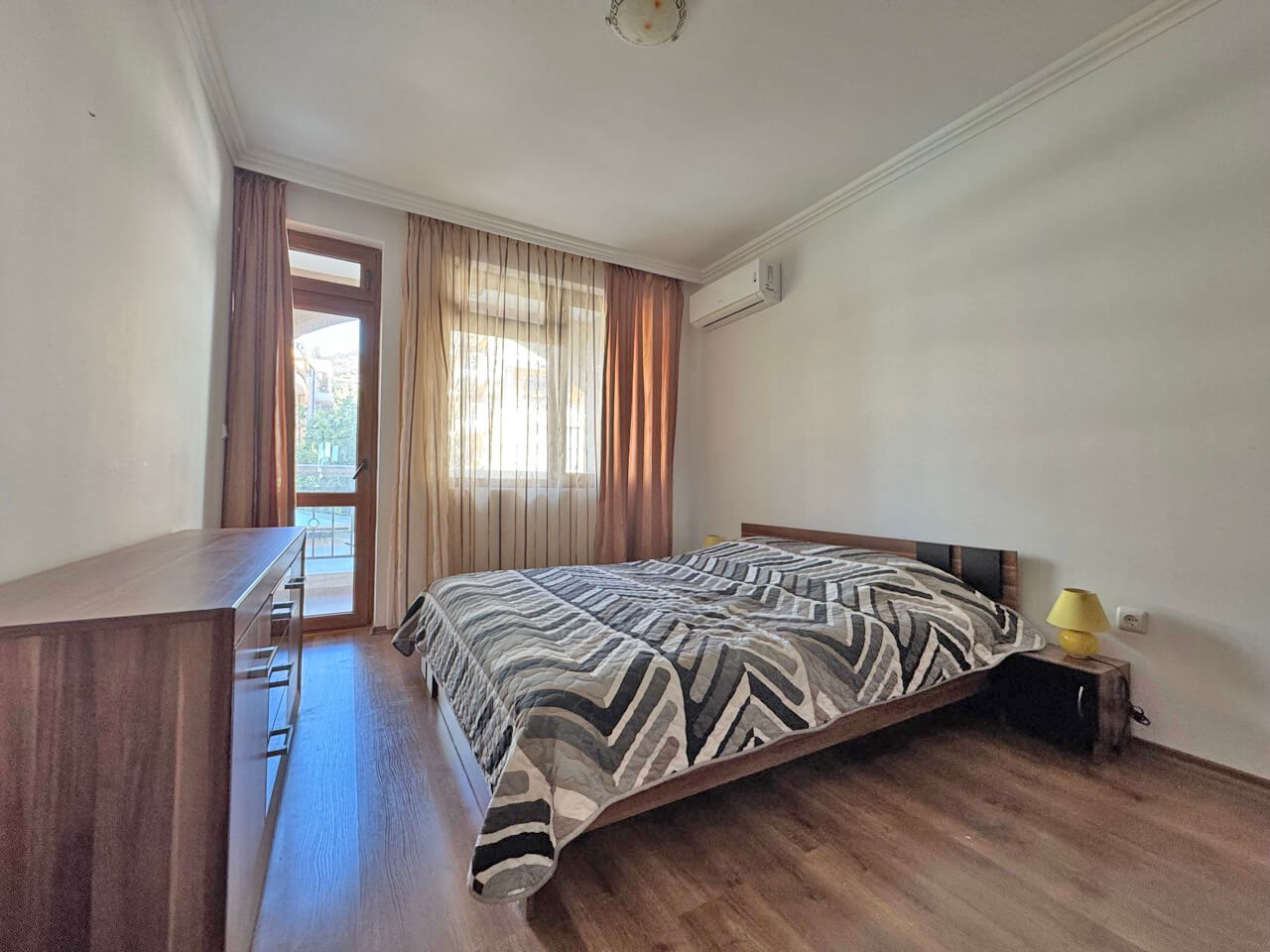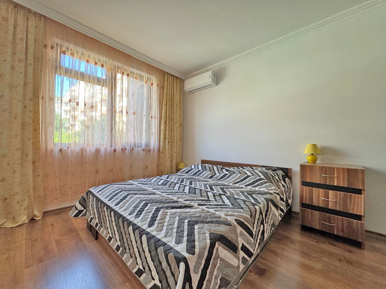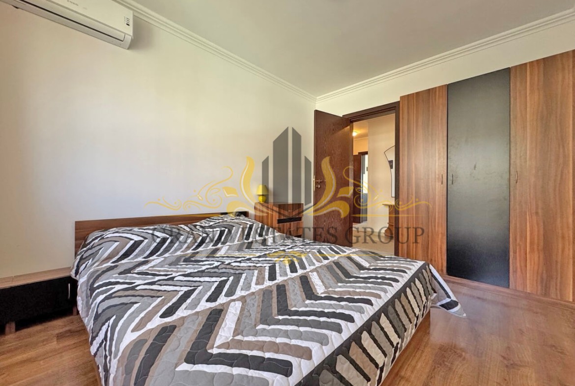 Квартира с 2-мя спальнями общей площадью 86 кв.м. расположена на 2-м этаже шестиэтажного здания с лифтом. Состоит из: прихожей, гостиной с кухней, двух спален, двух ванных комнат, террасы с видом на море и на бассейн и второй террасы с видом на бассейн соседнего комплекса. Квартира полностью укомплектована мягкой и встроенной мебелью и качественной бытовой техникой, кондиционерами.