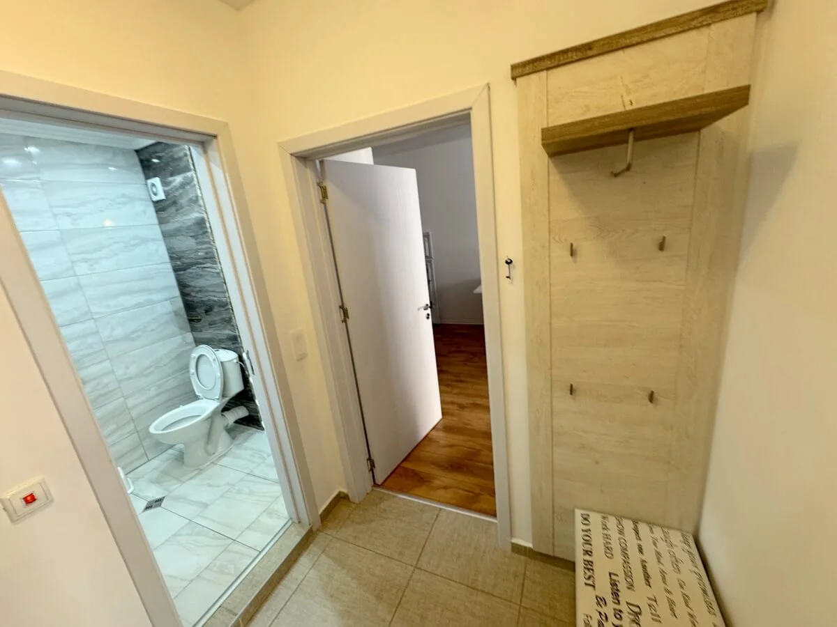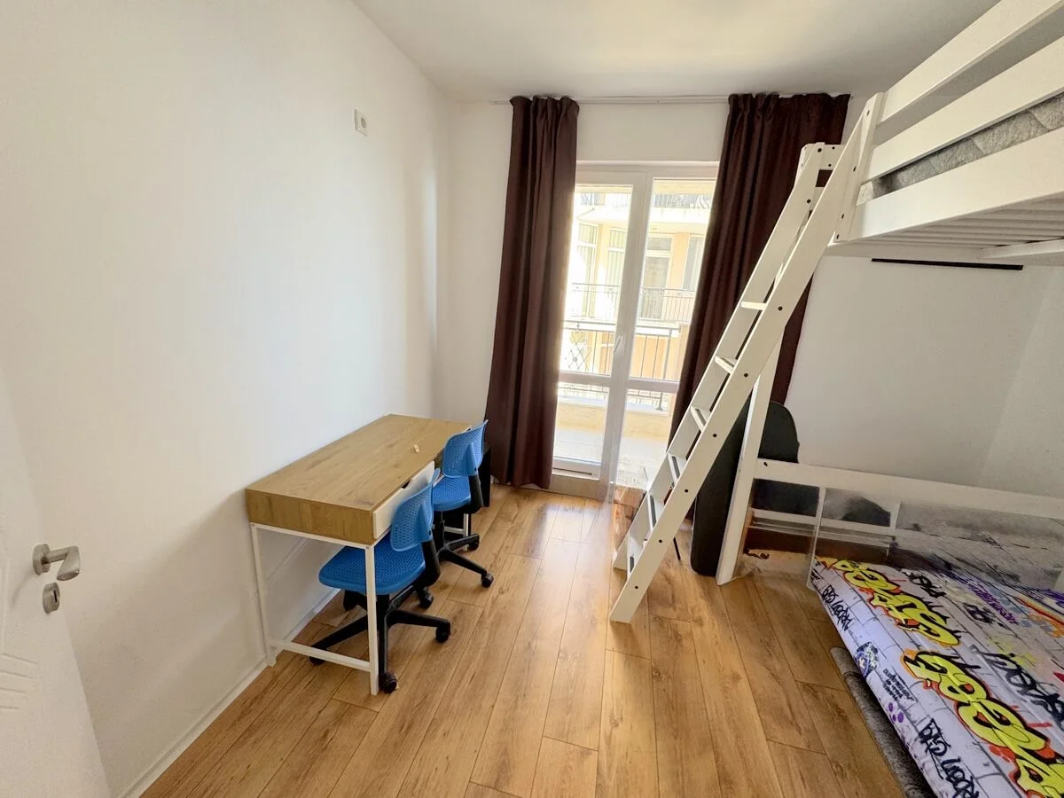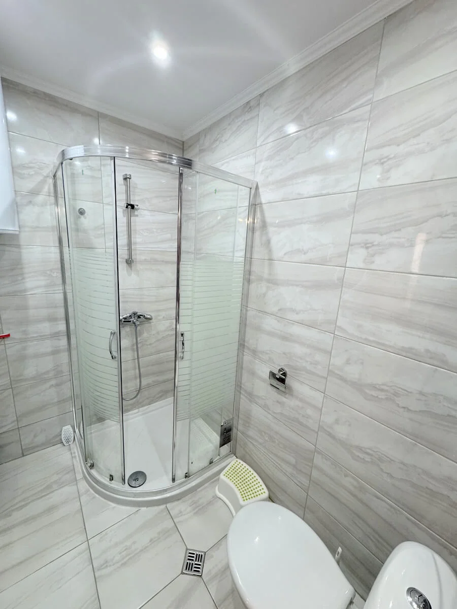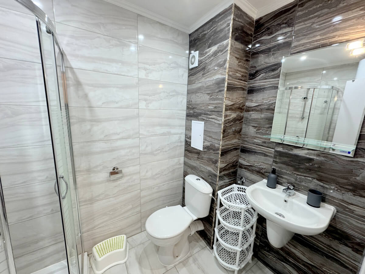 Квартира общей площадью 60 кв.м. расположена на 2 этаже шестиэтажного здания и состоит из прихожей, гостиной с зоной для кухни, спальни, санузла и террасы с видом на море.