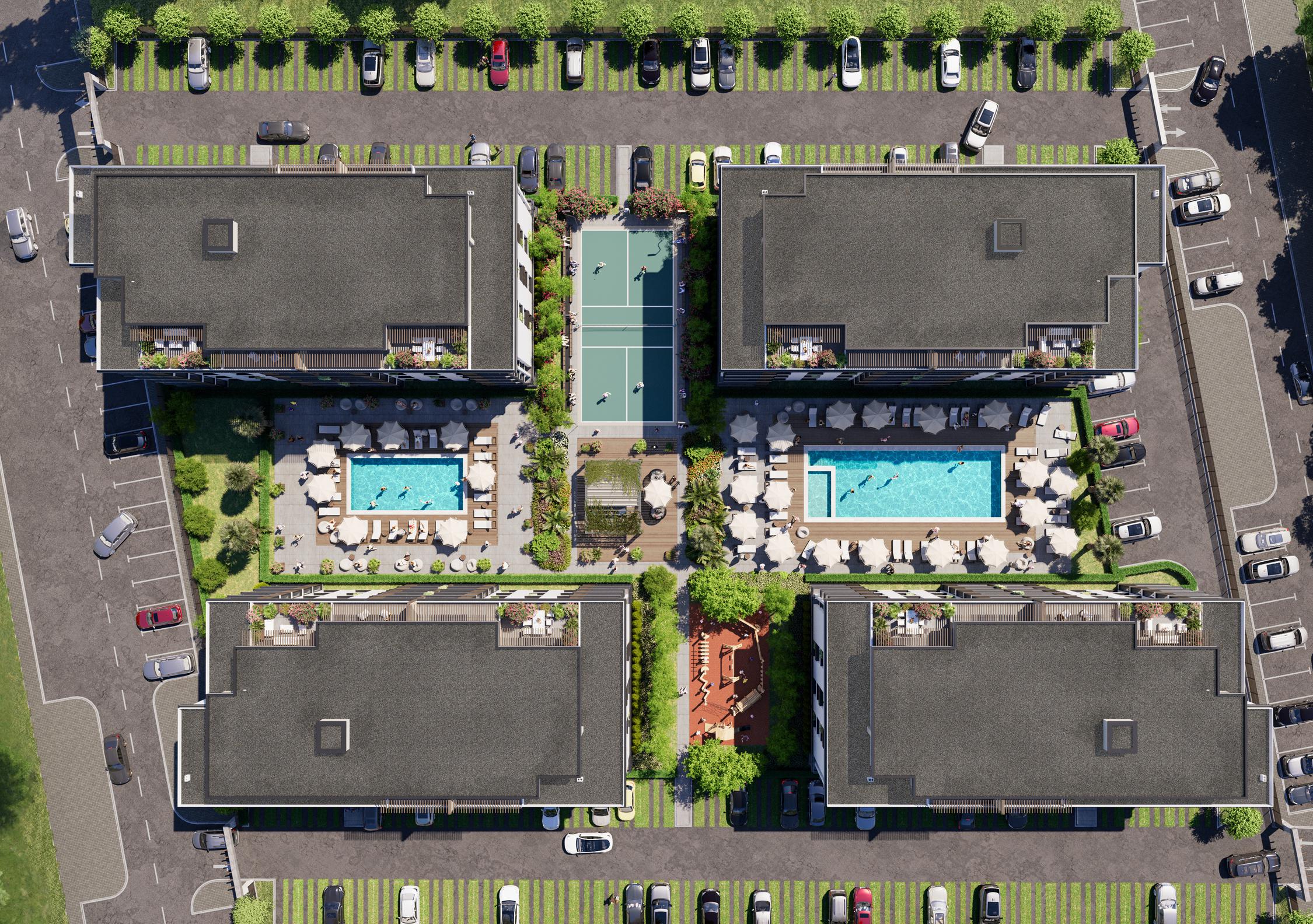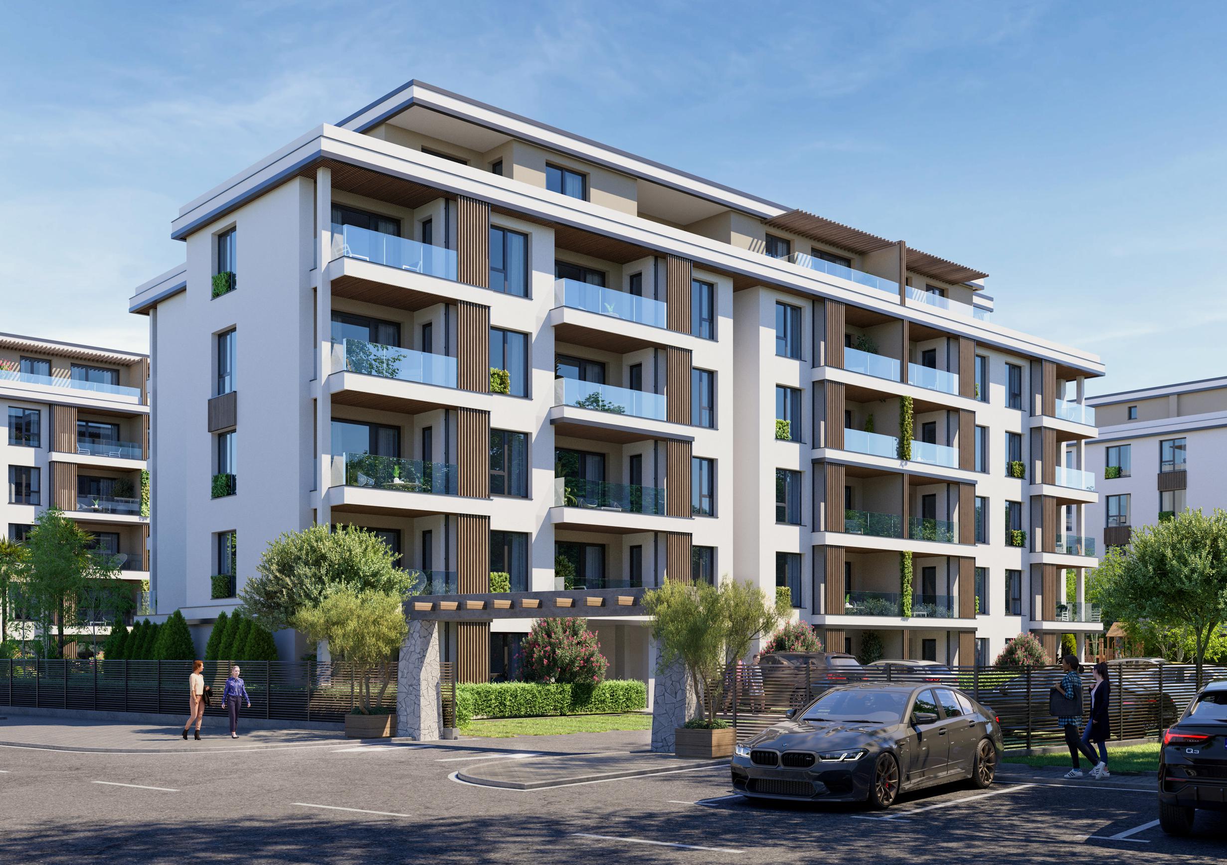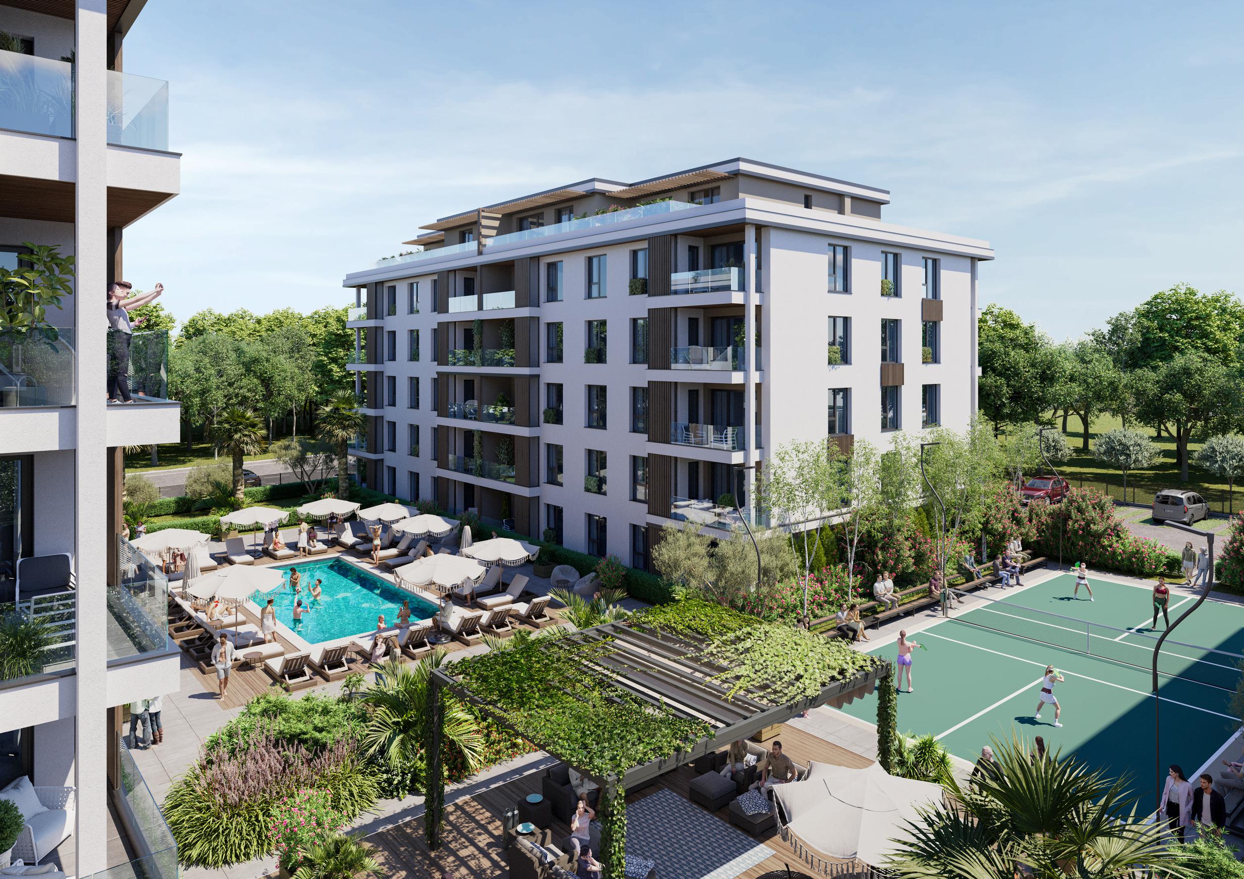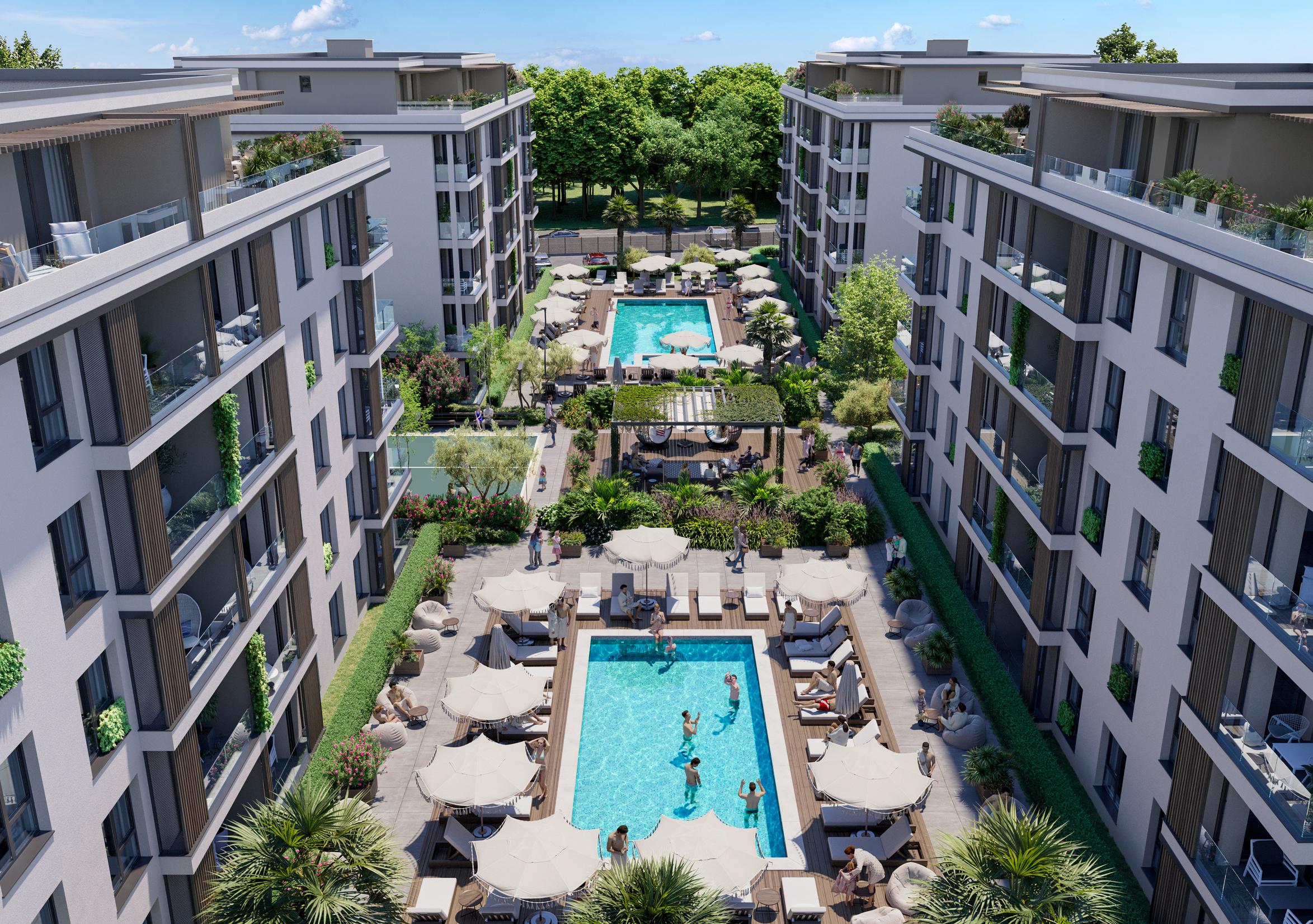 На территории комплекса будет: два открытых бассейна для взрослых и детский бассейн, богатое озеленение ландшафтный дизайн, спортивные площадки, место для велосипедов, охраняемая территория с контролируемым доступом, кладовки, открытые паркоместа и гаражи.