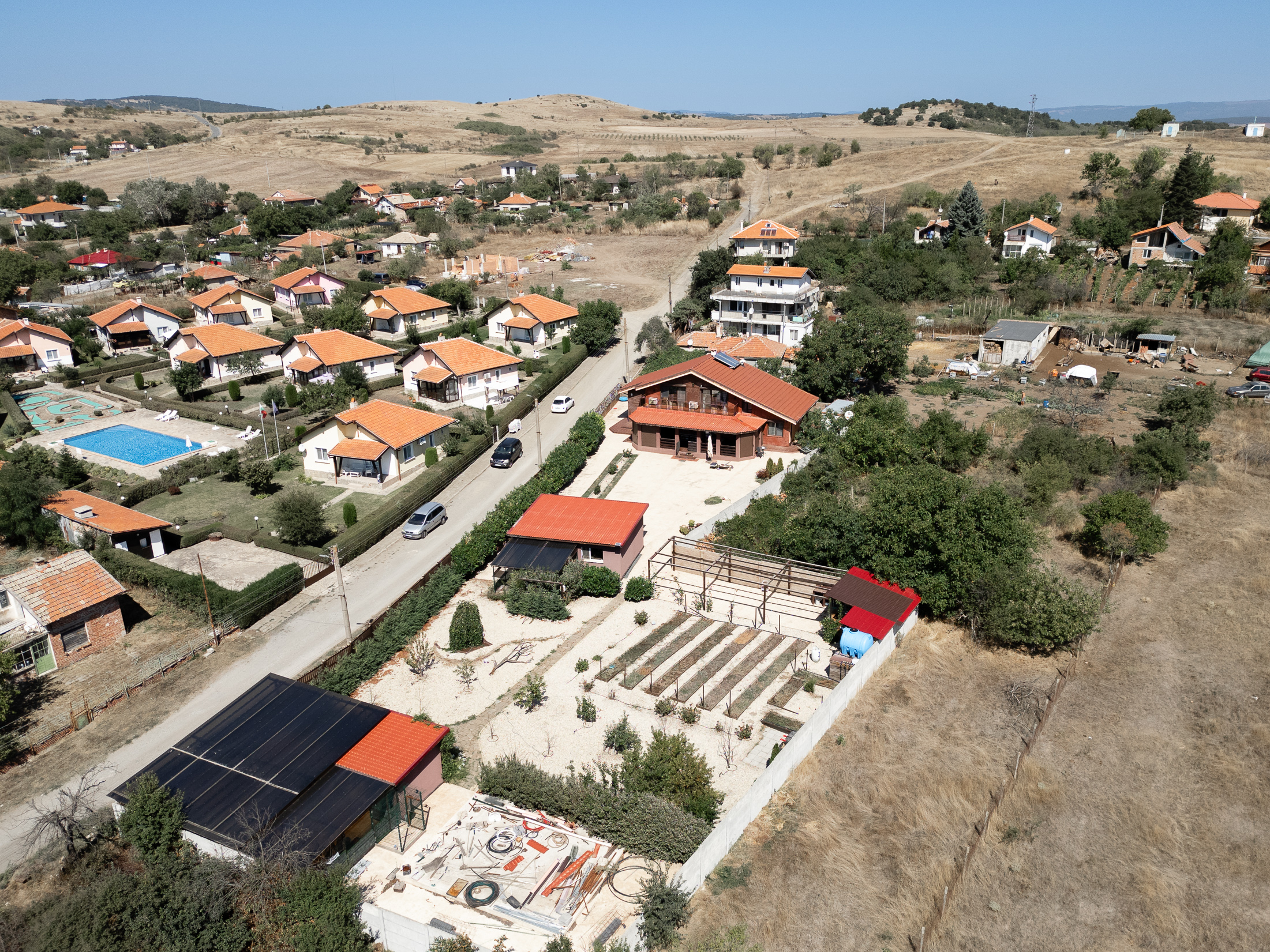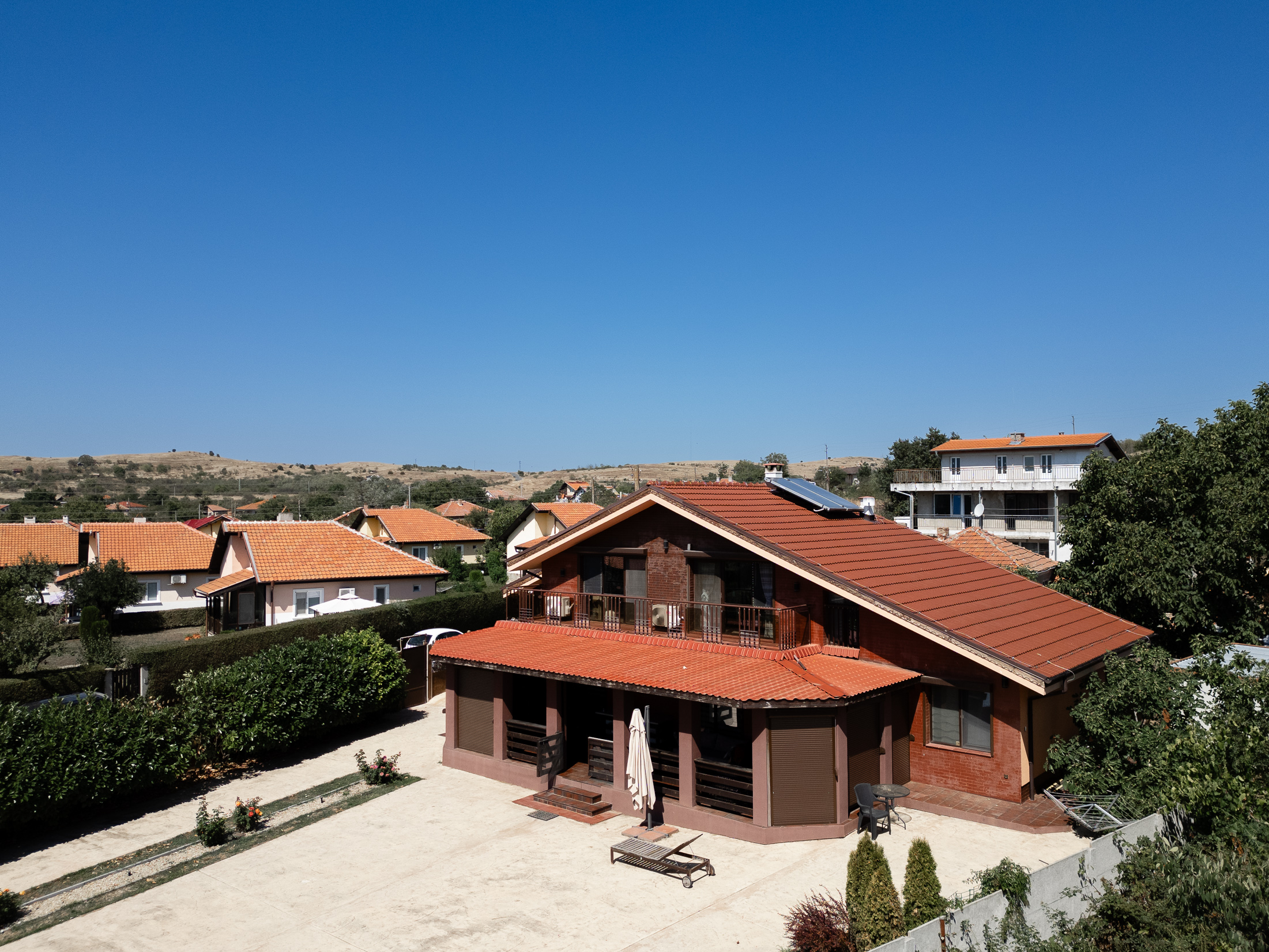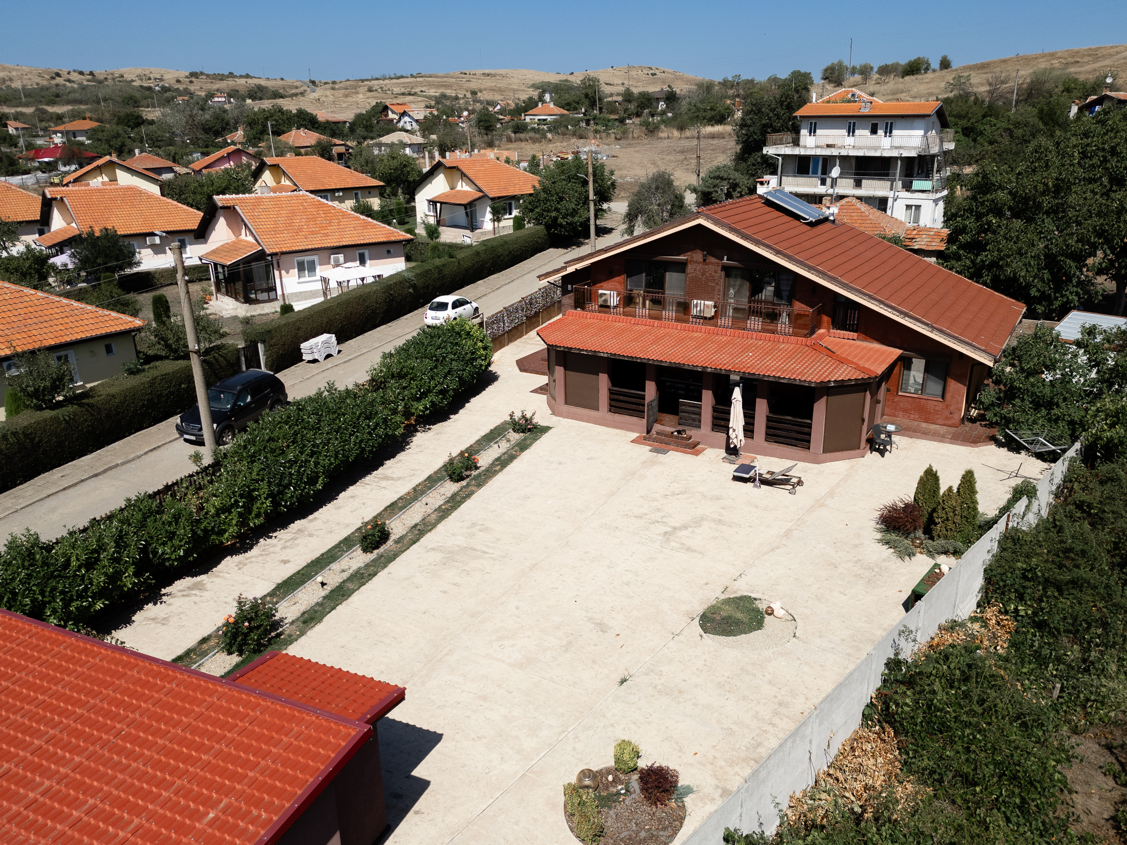 На участке, площадью 900 кв.м. есть барбекю, гараж и мастерская, огород и фруктовый сад. Есть возможность построить бассейн во дворе.