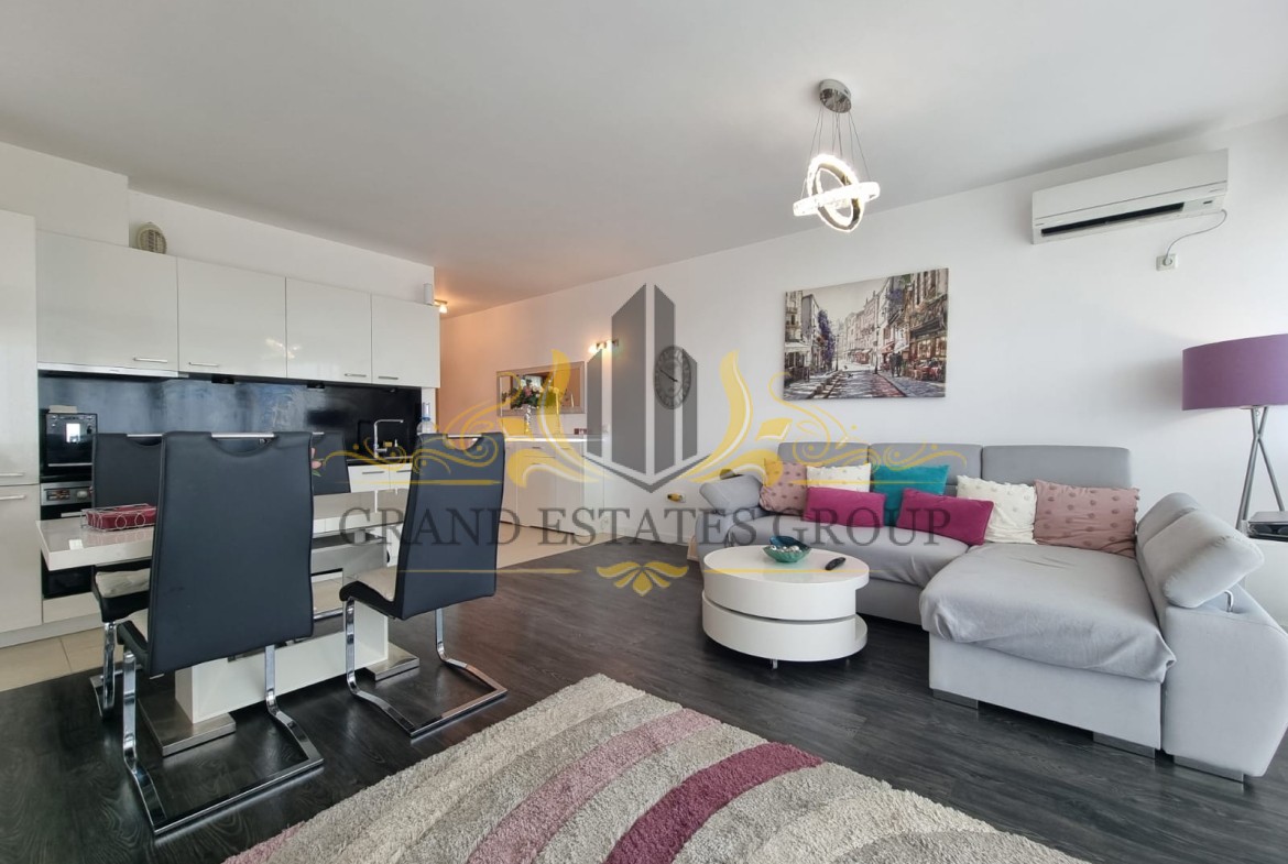 Квартира общей площадью 81,80 м2. расположена на первом этаже здания комплекса Планировка включает: прихожую, просторную солнечную гостиную с кухней и обеденной зоной, уютную спальню с индивидуальным балкончиком, санузел с душевой кабиной и балкон с приятным видом на море и Солнечный берег. Квартира полностью оснащена качественной мебелью и техникой!