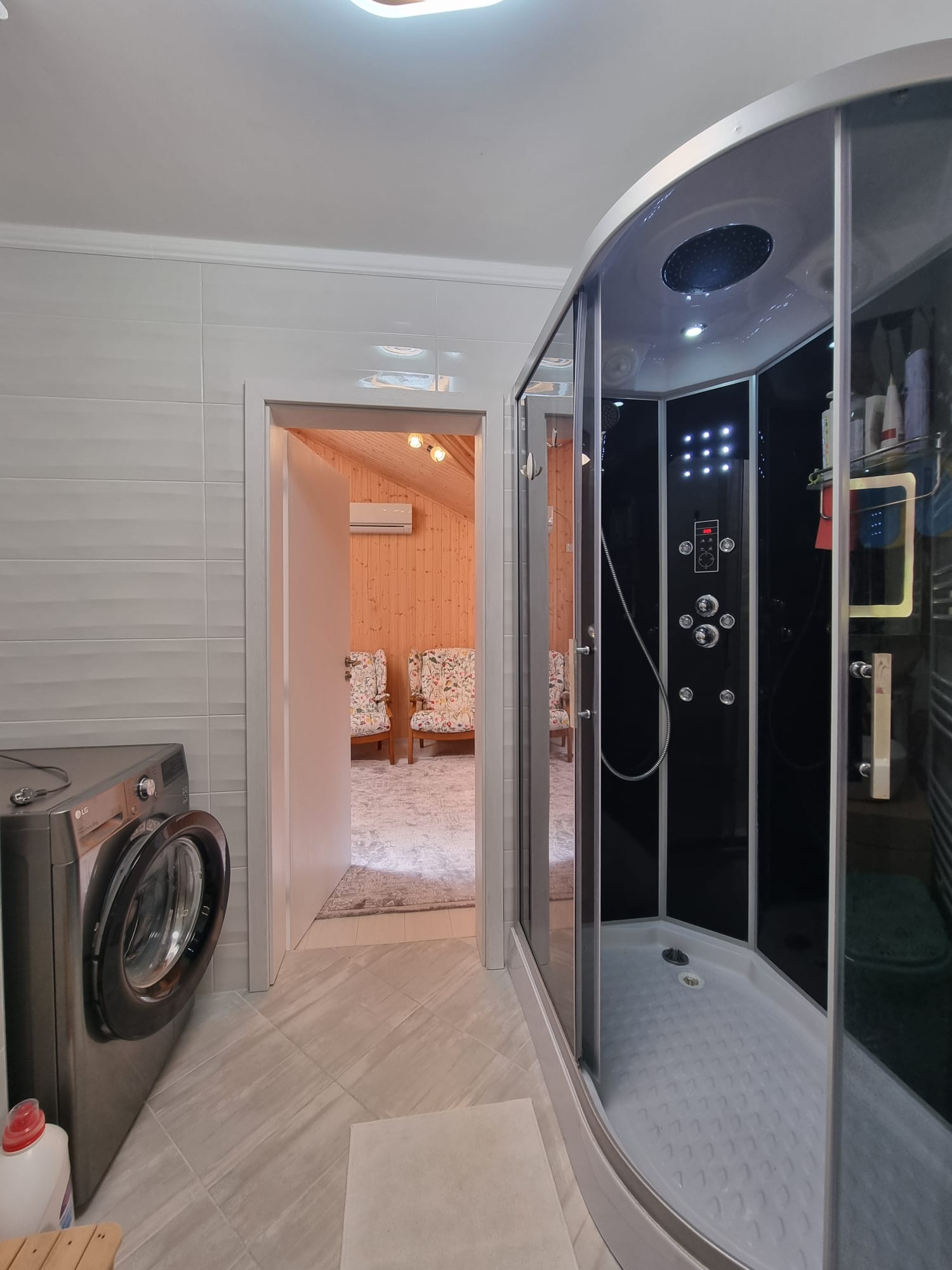 На первом этаже расположены: прихожая, гостиная с электрическим камином, кухня, столовая с выходом на большую террасу, спальня и санузел с душевой кабиной.