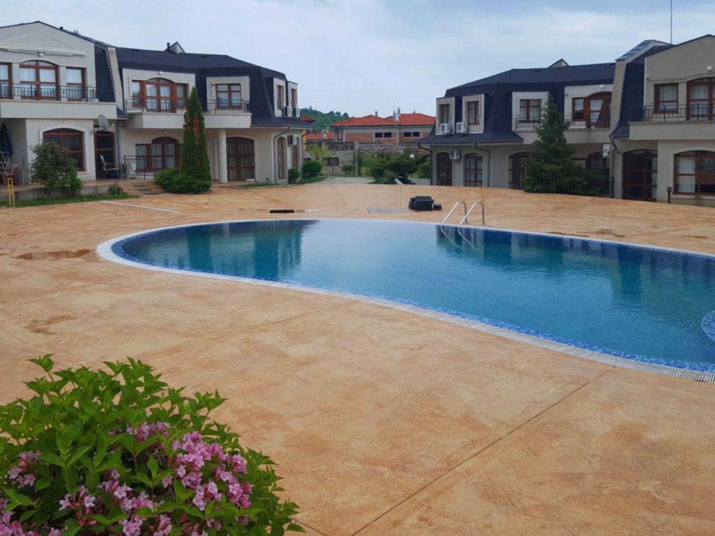 На охраняемой территории имеются бассейны с зонами отдыха, ресторан, кафе, парковка