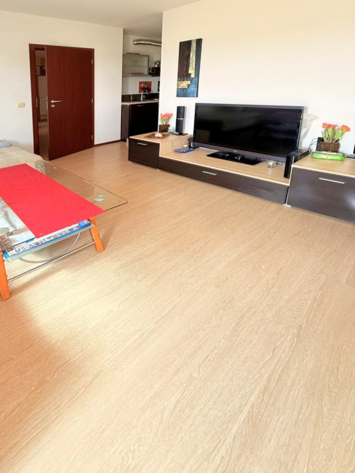 Квартира состоит из: прихожей, светлой и просторной гостиной с кухонным уголком, двух спален, ванной комнаты и террасы с прекрасным видом.
