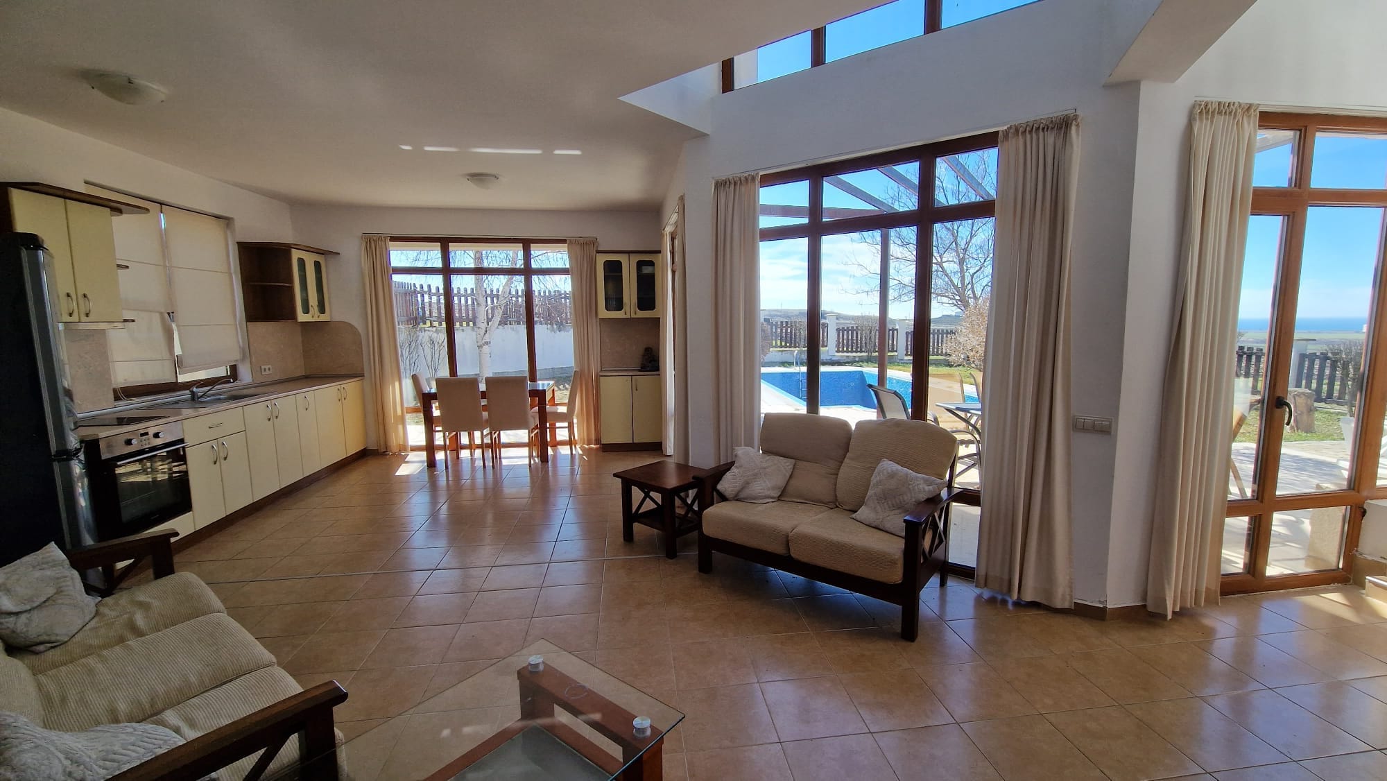 На первом этаже гостиная с кухонной зоной и столовой, ванная комната, терраса. На втором этаже — две спальни, две ванных комнаты, две террасы. Дом отличном состоянии! Продается с мебелью и техникой. Вид на бассейн и море!