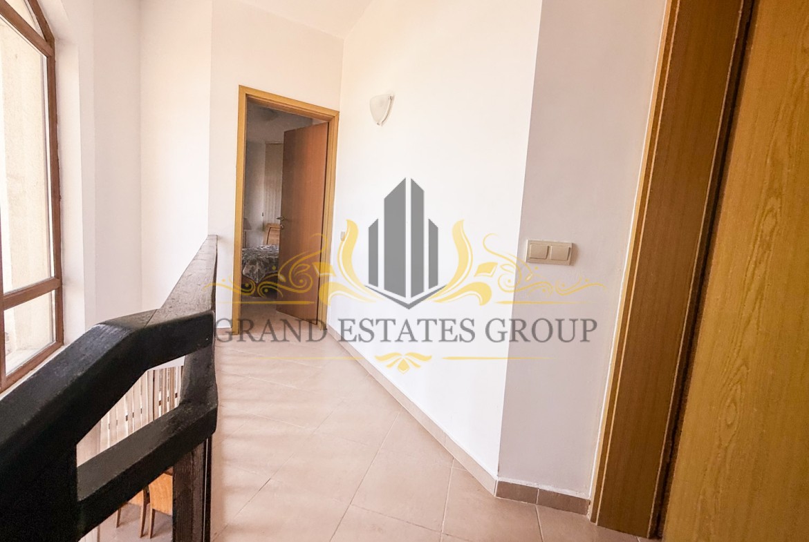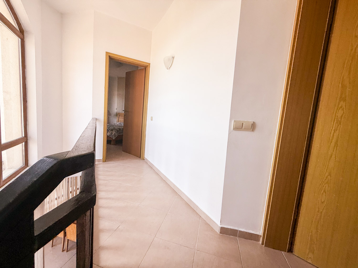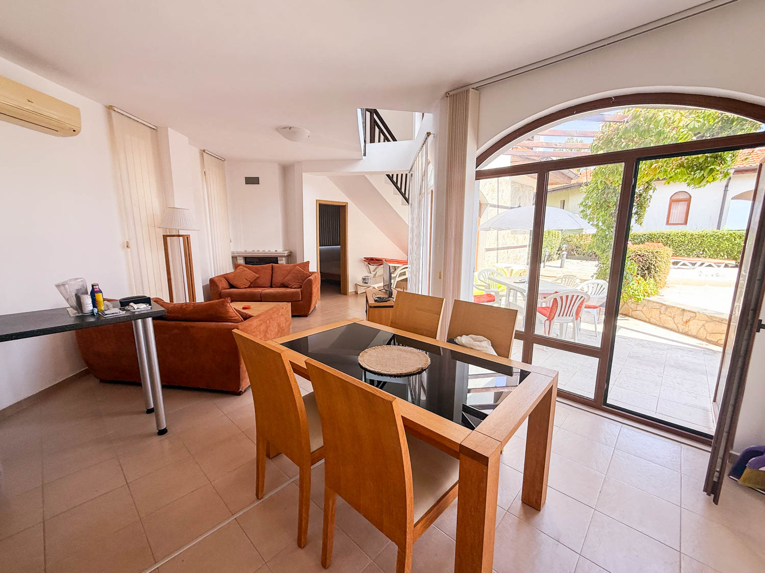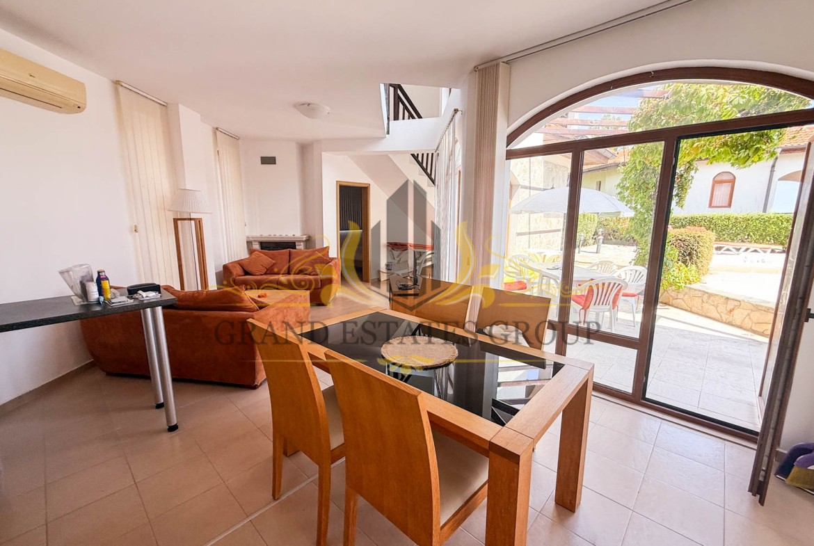 На первом этаже гостиная с кухонной зоной и столовой, спальня, ванная комната, терраса. На втором этаже — две спальни, две ванных комнаты. Из каждой комнаты есть выход на террасу. Дом отличном состоянии! Продается с мебелью и техникой. Вид на бассейн и море!