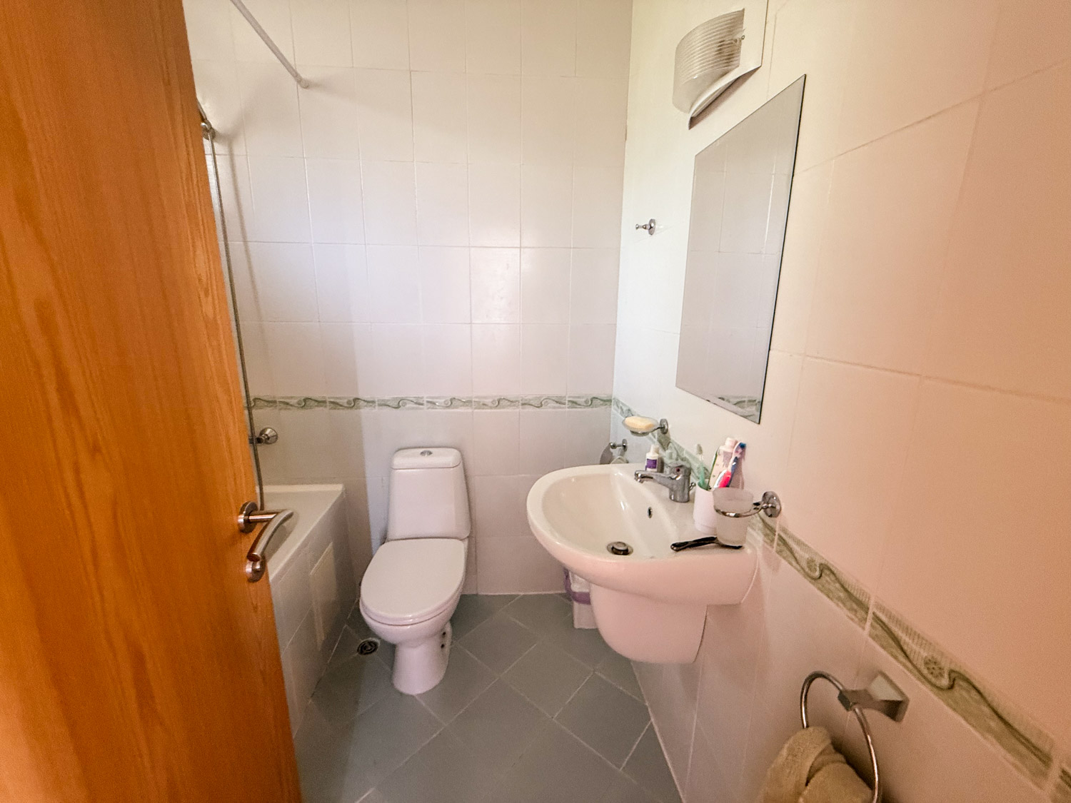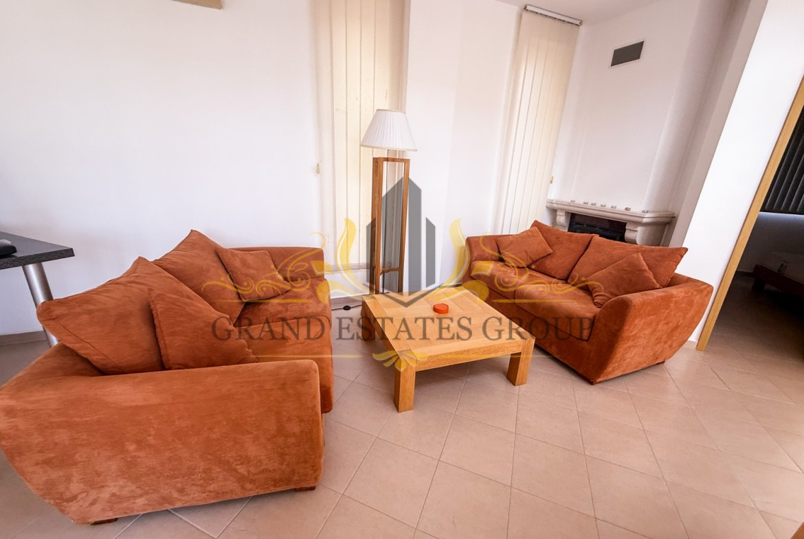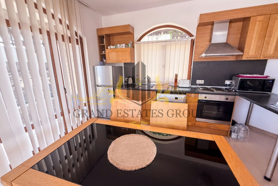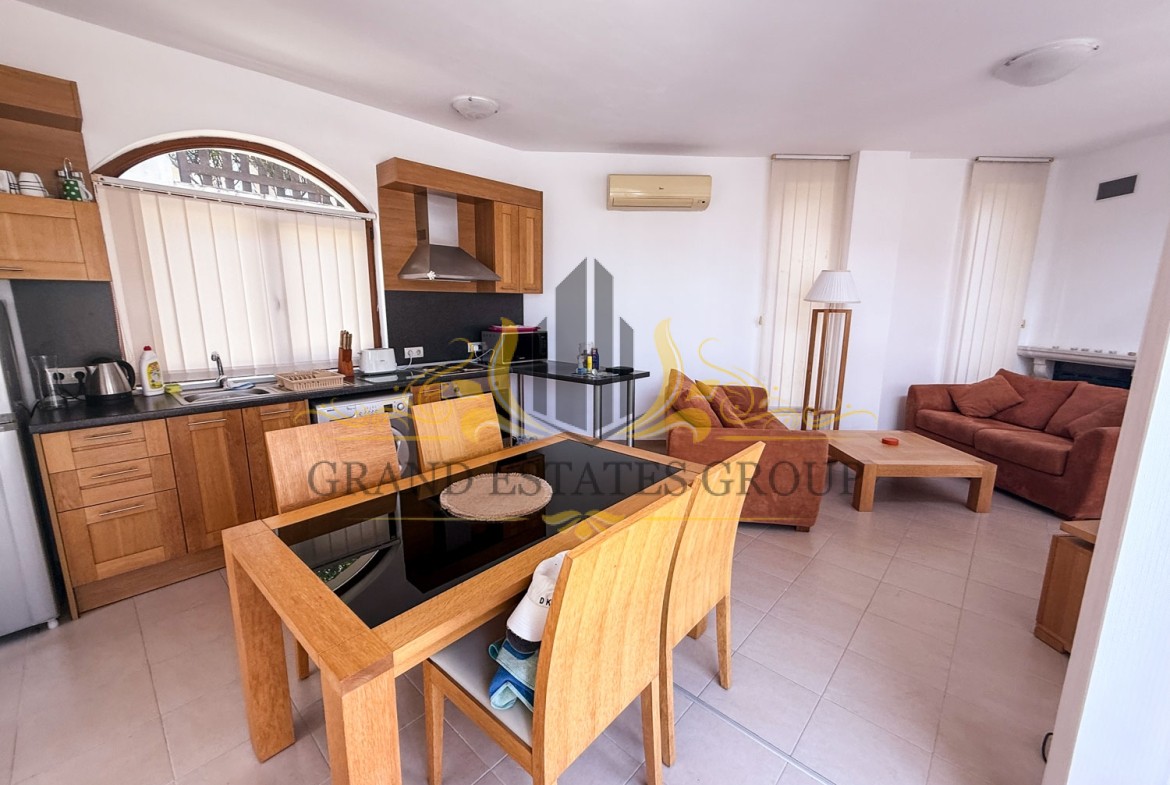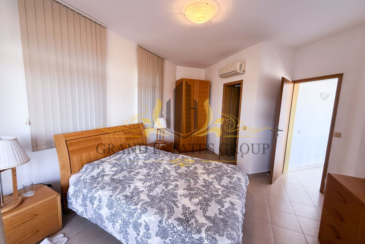 На первом этаже гостиная с кухонной зоной и столовой, спальня, ванная комната, терраса. На втором этаже — две спальни, две ванных комнаты. Из каждой комнаты есть выход на террасу. Дом отличном состоянии! Продается с мебелью и техникой. Вид на бассейн и море!
