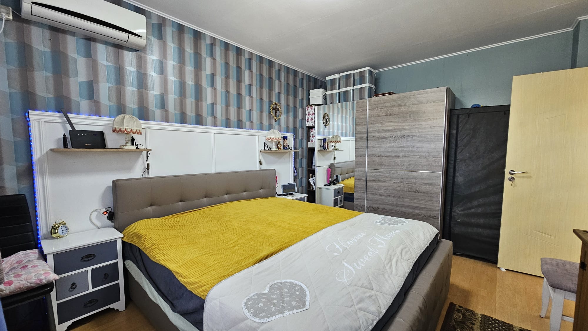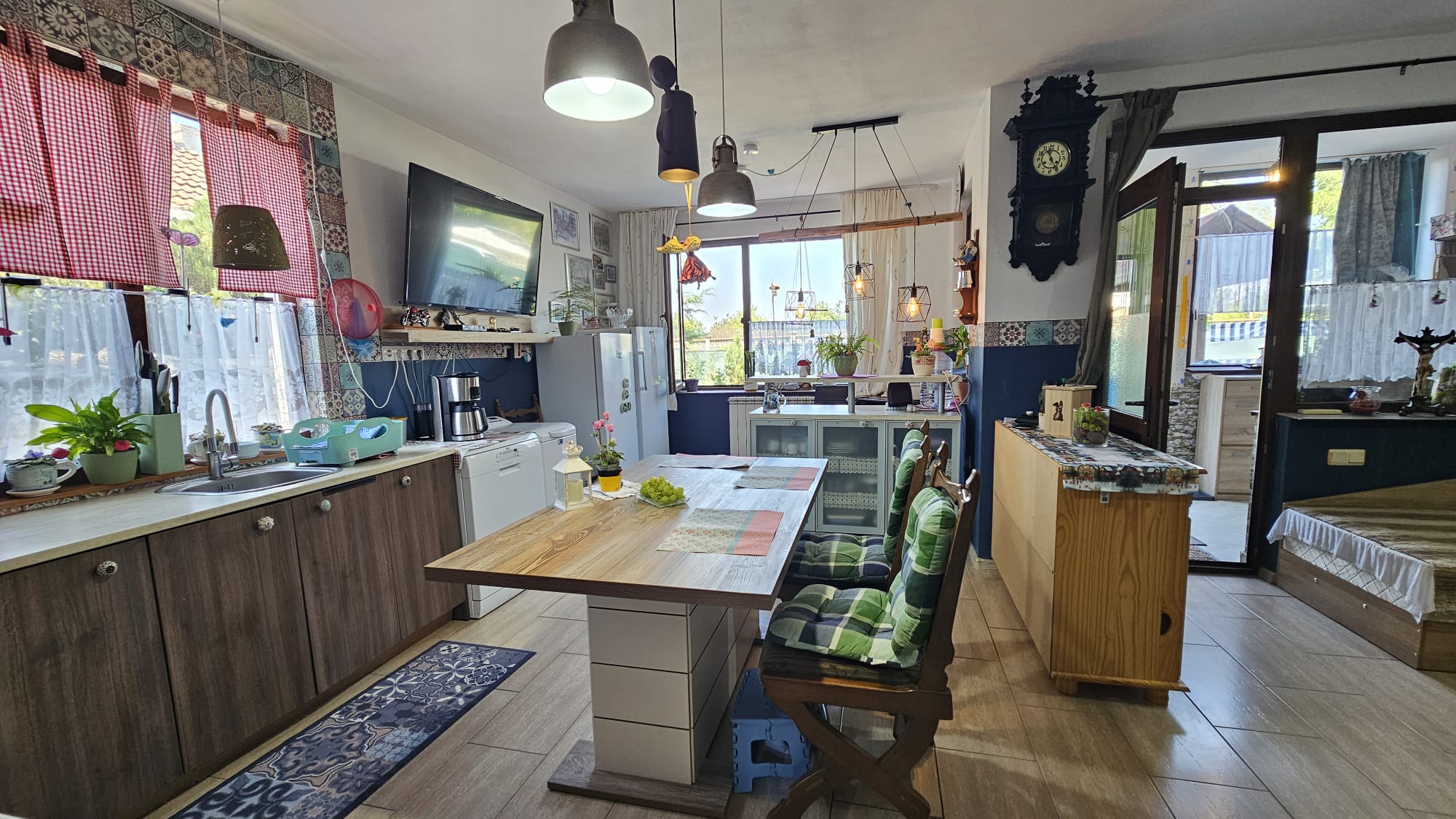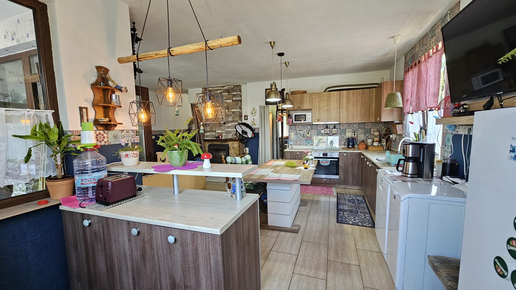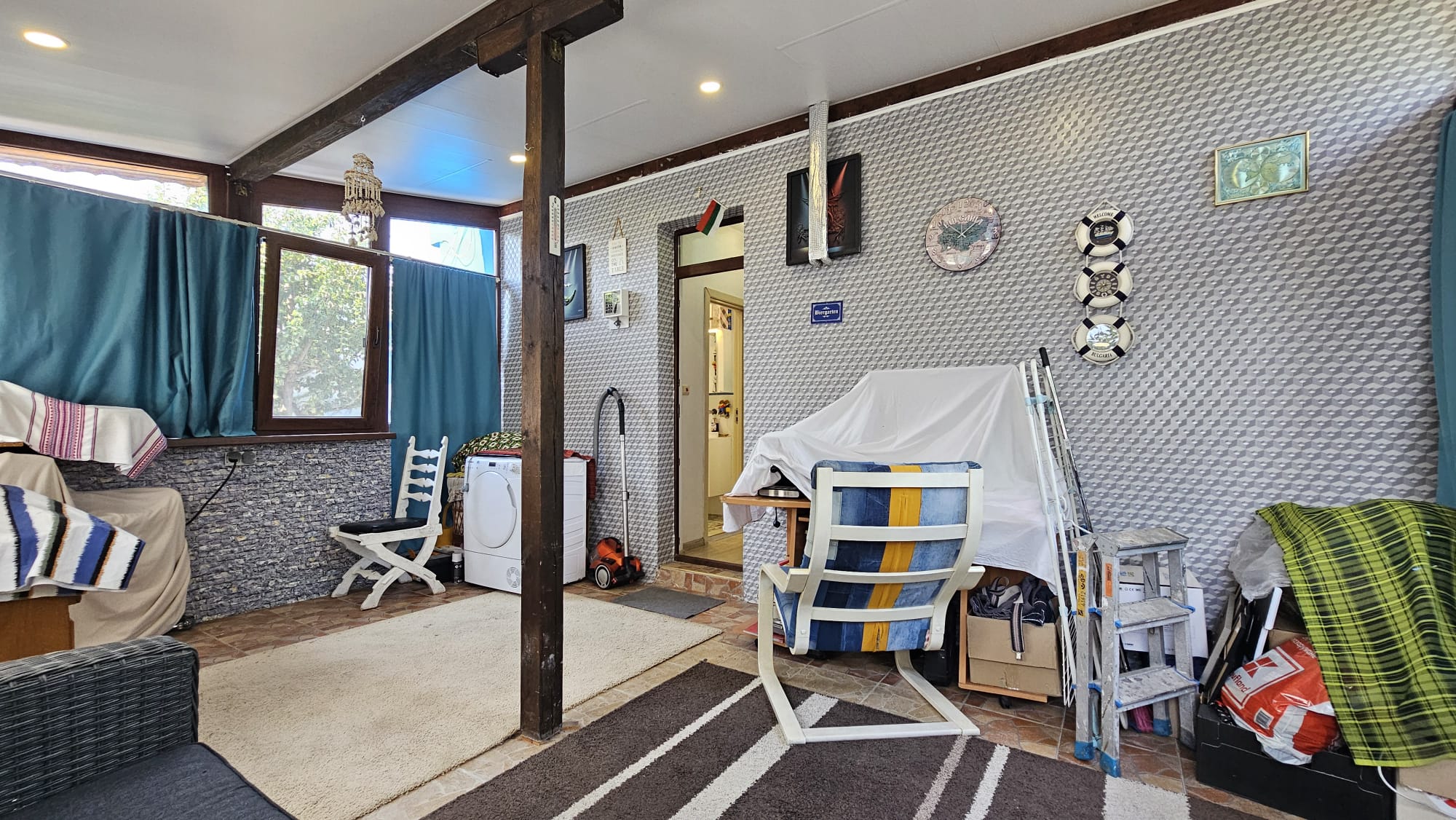 Дом общей площадью 130 м2 состоит из: Первый этаж: прихожей, просторной гостиной с кухонной зоной и камином с радиаторным разведением на каждую комнату, санузла с душем, кладового помещения с бойлером и закрытой верандой. Второй этаж: коридора с выдвижной лестницей на небольшое чердачное помещение, двух спален с общей террасой и санузла с душевой кабиной. Дом оснащён мебелью и техникой, в каждой комнате установлены кондиционеры, стоят солнечные панели.