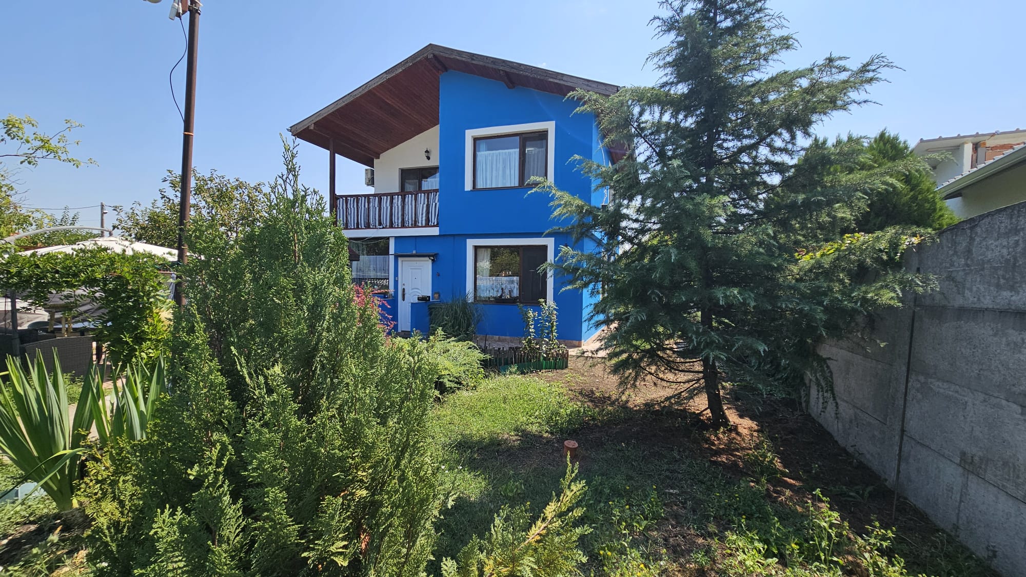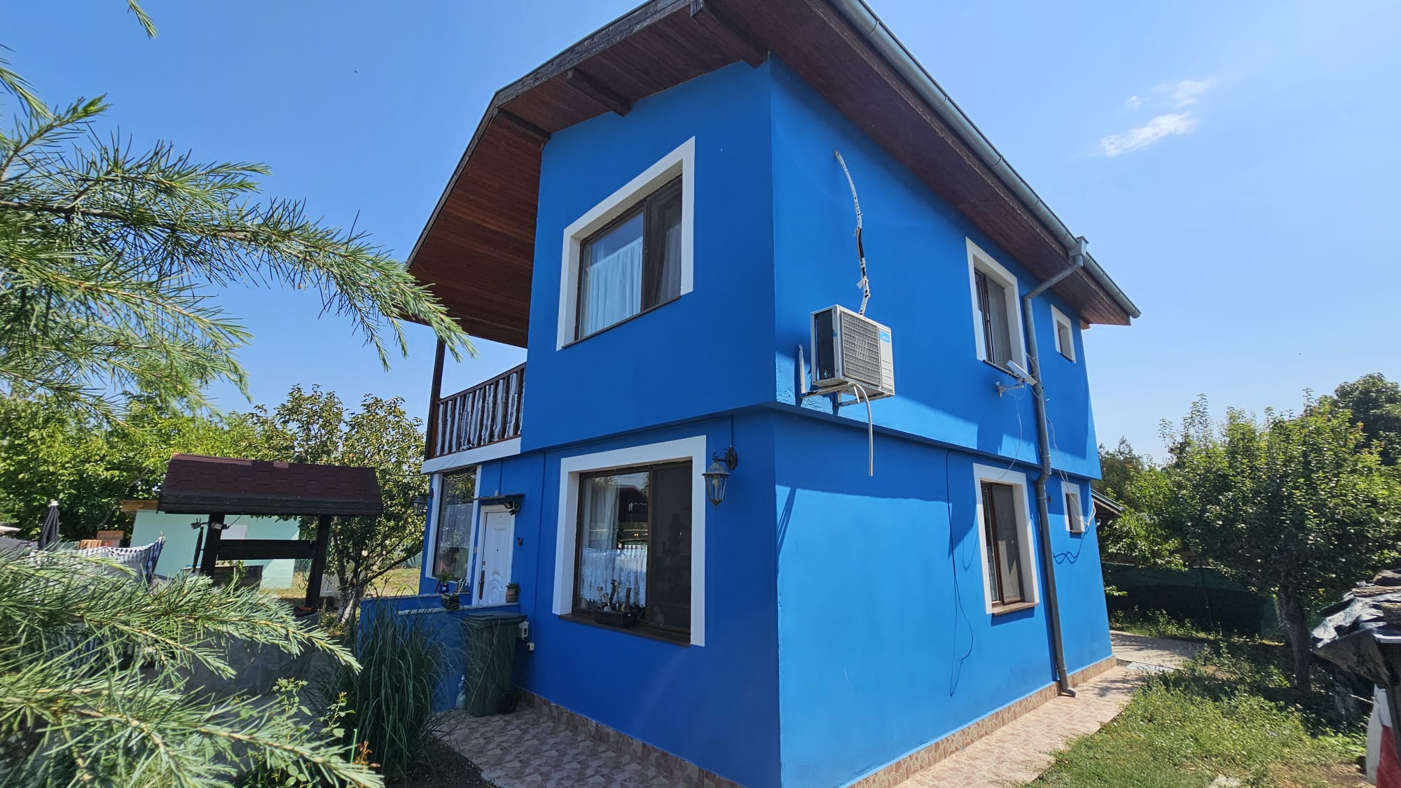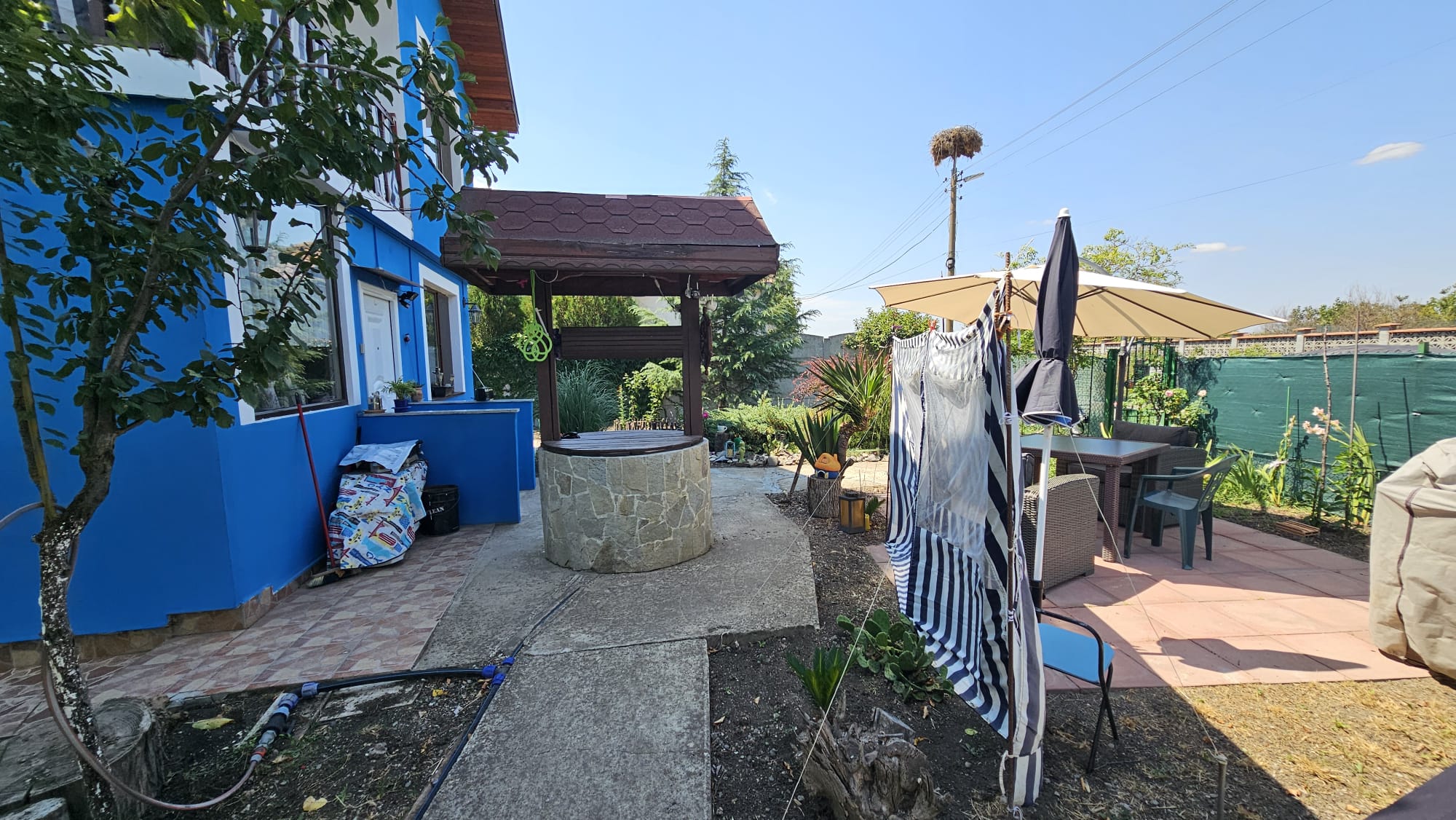 Дом построен на ухоженном участке площадью 613 м2 с комфортной зоной отдыха, парковкой, колодцем, складом-мастерской и множеством зелёных насаждением и плодовых деревьев.
