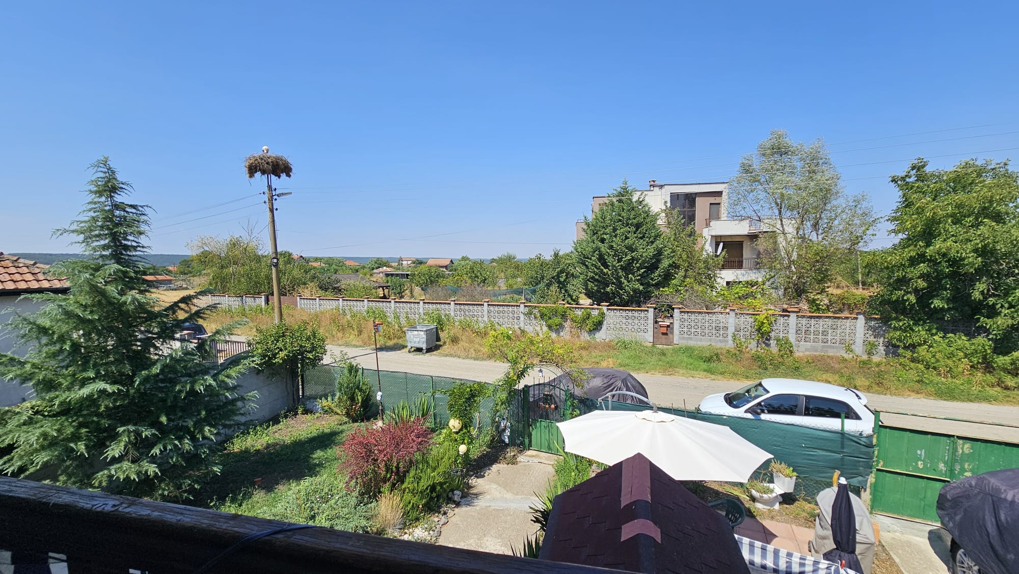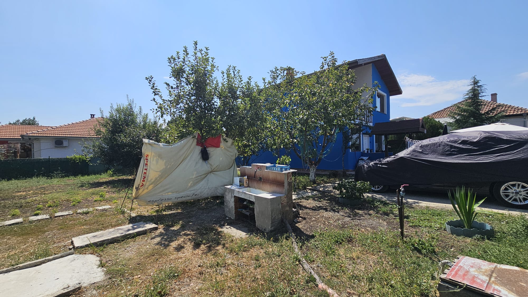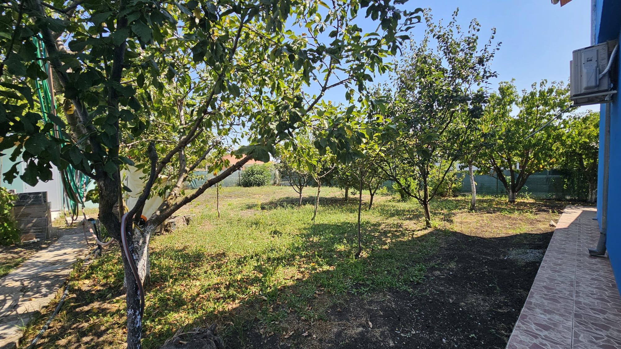Дом построен на ухоженном участке площадью 613 м2 с комфортной зоной отдыха, парковкой, колодцем, складом-мастерской и множеством зелёных насаждением и плодовых деревьев.